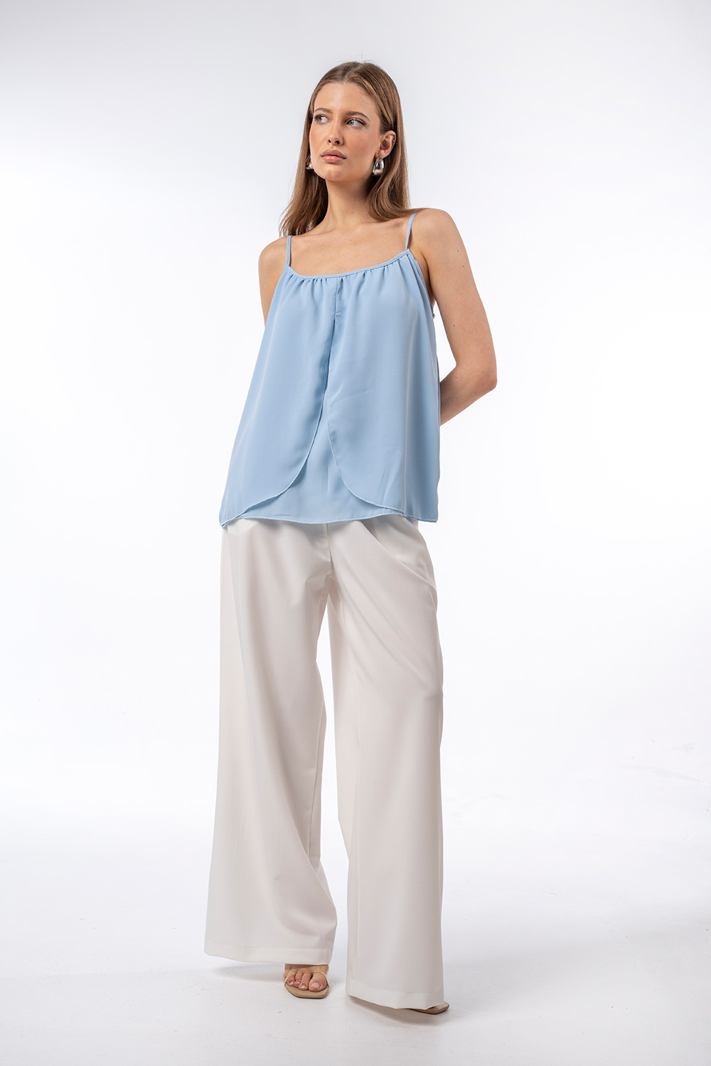 Αναδείξτε τη θηλυκή και κομψή πλευρά σας με αυτό το αέρινο top, με χαλαρή γραμμή και ελαφρύ ύφασμα που αγκαλιάζει διακριτικά το σώμα, προσφέρει άνεση και κίνηση σε κάθε σας εμφάνιση.