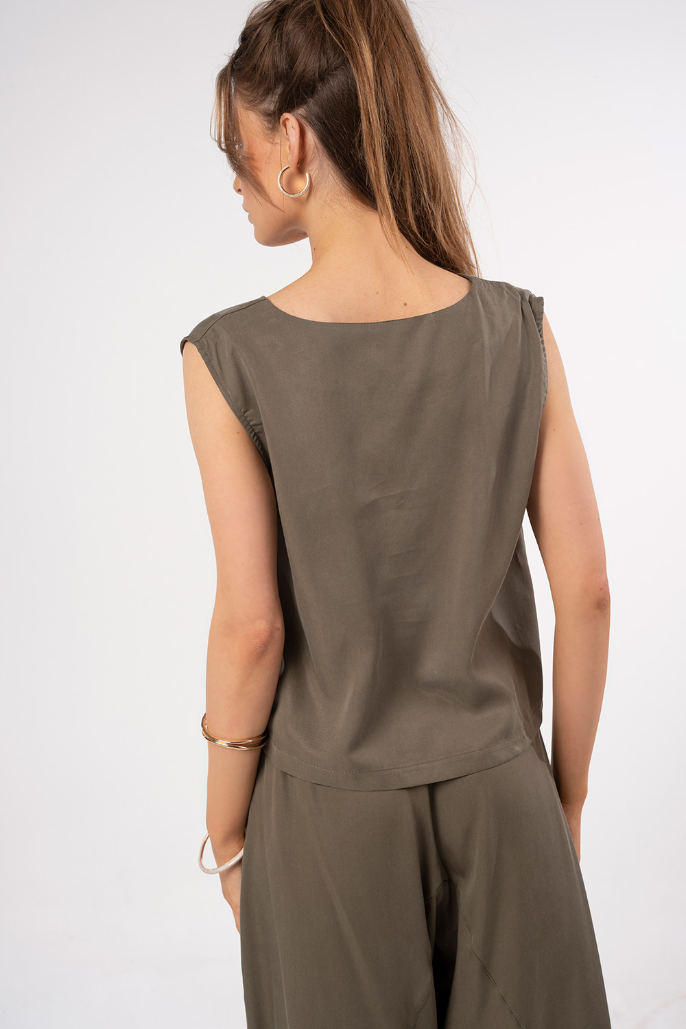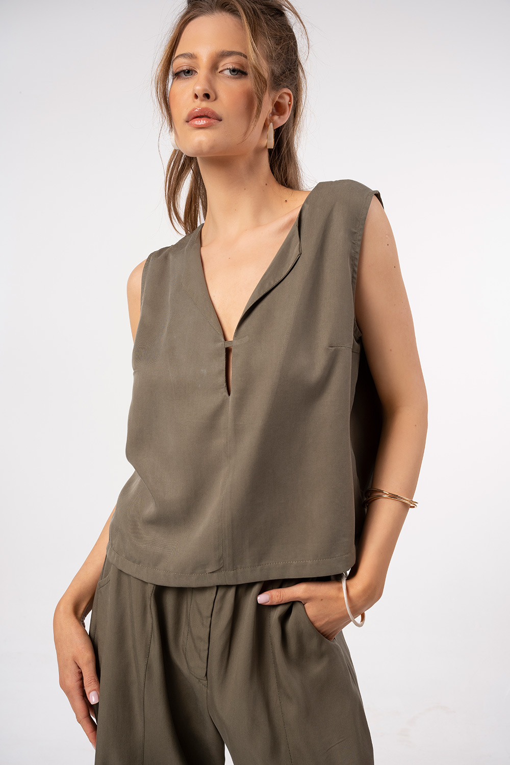 Minimal και κομψή αμάνικη μπλούζα σε χακί απόχρωση, ιδανική για effortless καθημερινά looks. Το διακριτικό V άνοιγμα στο μπούστο προσθέτει θηλυκότητα, ενώ η χαλαρή γραμμή εξασφαλίζει άνεση και κομψότητα.