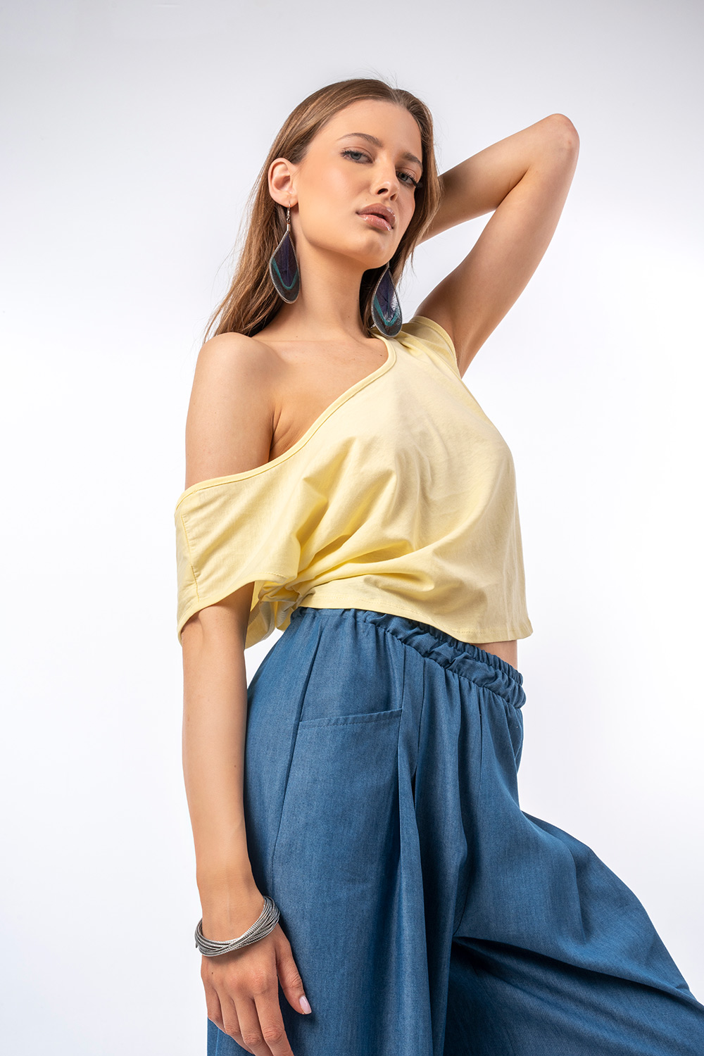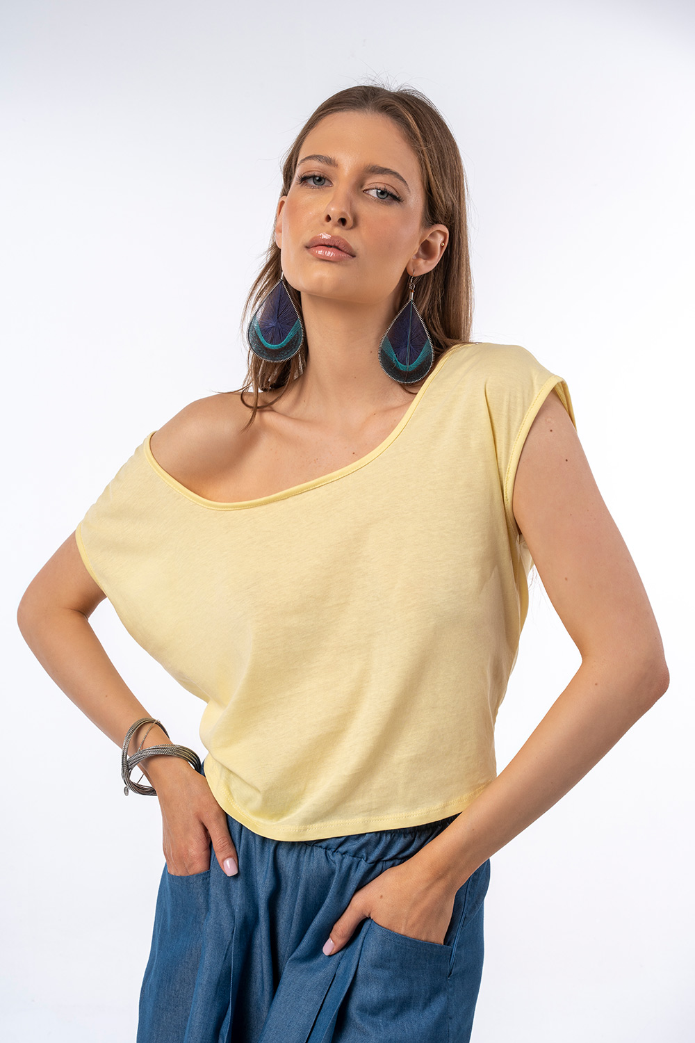 Αέρινη και μοντέρνα μπλούζα σε παστέλ κίτρινη απόχρωση, με χαλαρή γραμμή και θηλυκή ανοιχτή πλάτη με κουμπιά και δέσιμο. Φοριέται άνετα off-shoulder για πιο stylish εμφανίσεις, ιδανική για casual αλλά και chic looks. Συνδυάζεται εύκολα με παντελόνες ή φούστες για όλες τις ώρες της ημέρας.
