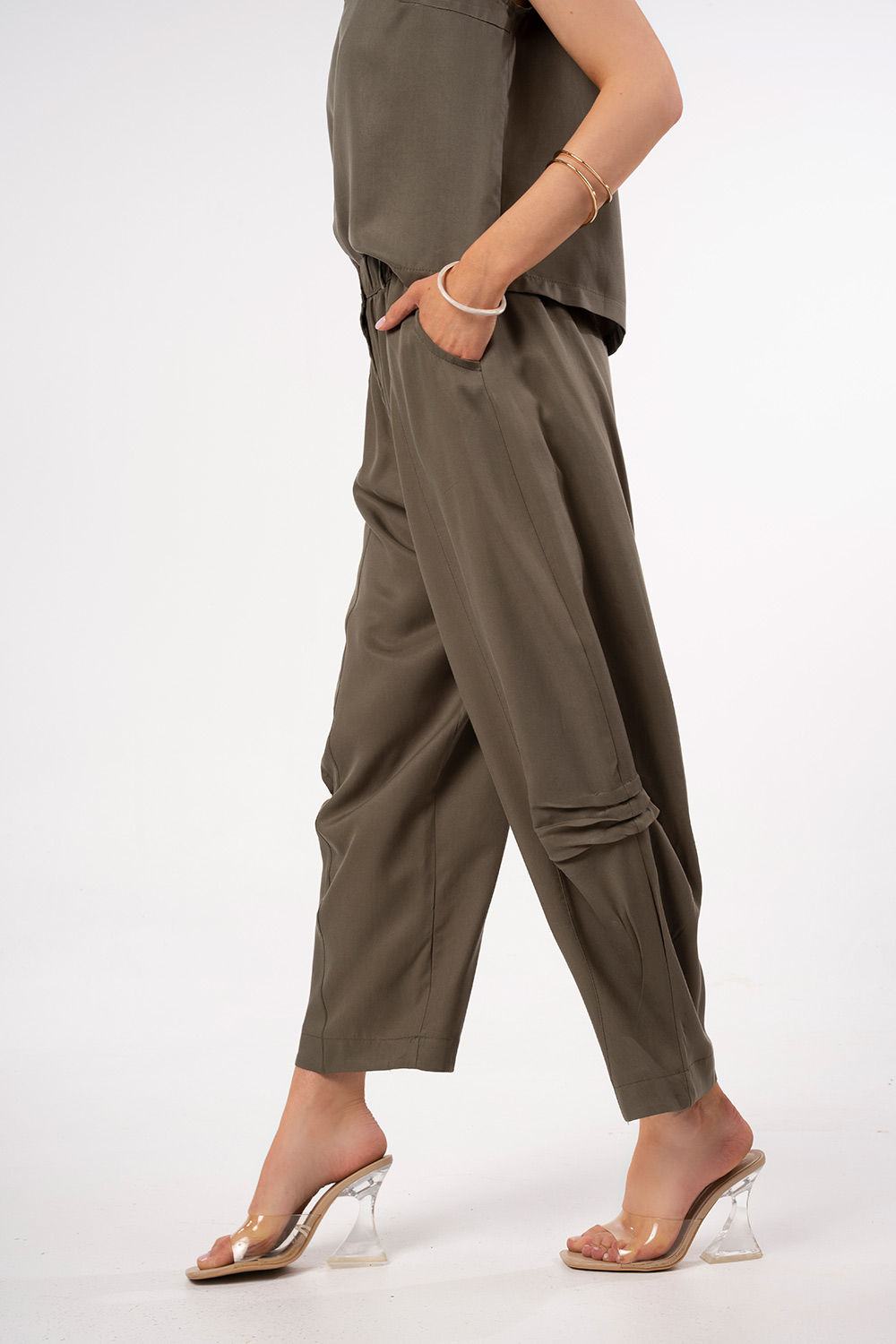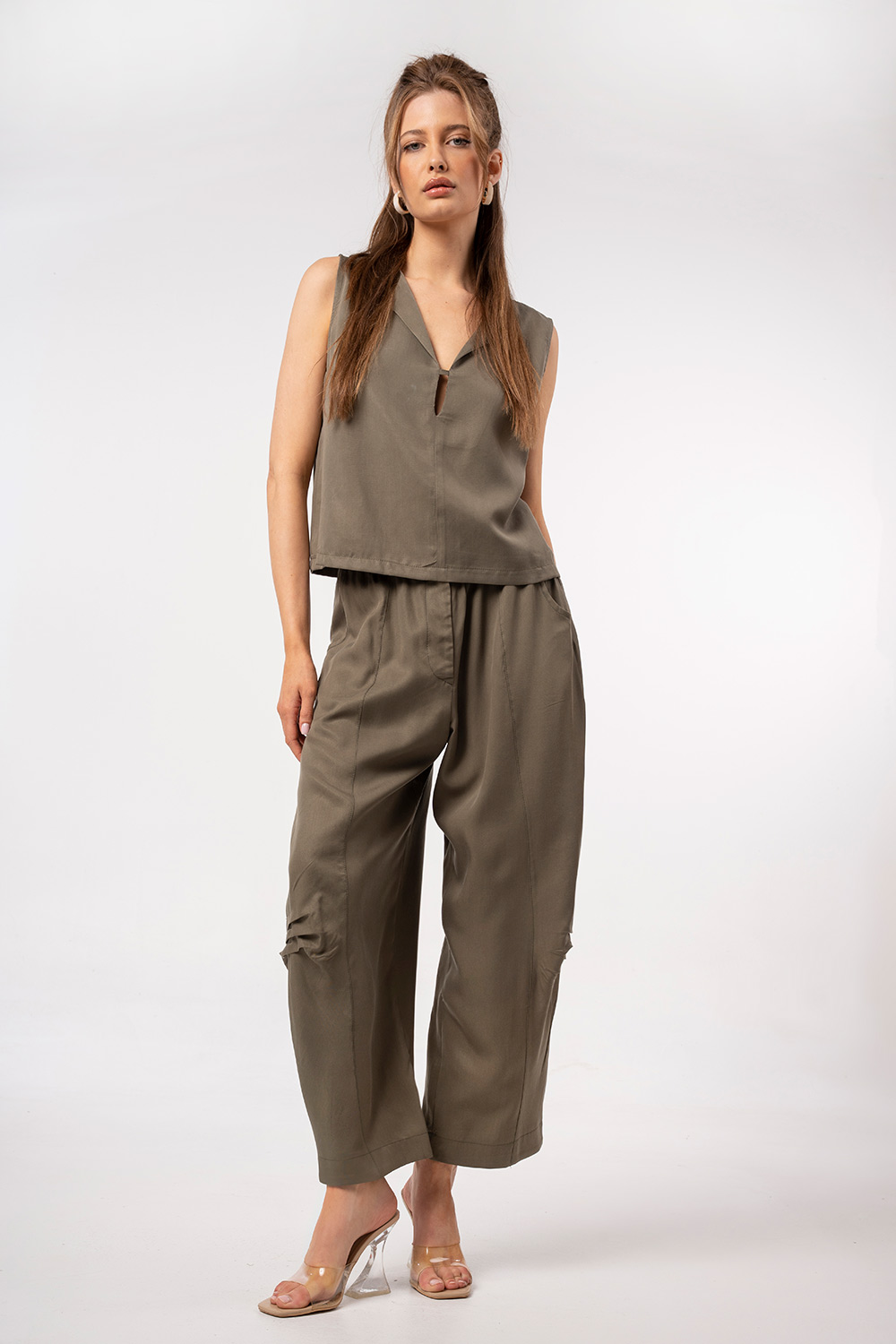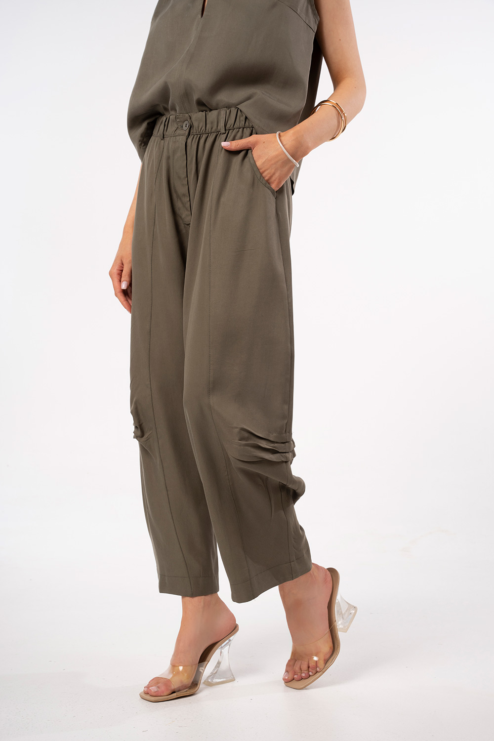 Άνετο και κομψό παντελόνι, ιδανικό για καθημερινές αλλά και πιο προσεγμένες εμφανίσεις. Διαθέτει ψηλόμεση εφαρμογή με ελαστική μέση για τέλεια προσαρμογή και άνεση όλη μέρα. Το ύφασμα είναι απαλό και ελαφρύ, ενώ η γραμμή του είναι χαλαρή με διακριτικές πιέτες που προσθέτουν στυλ και κίνηση.