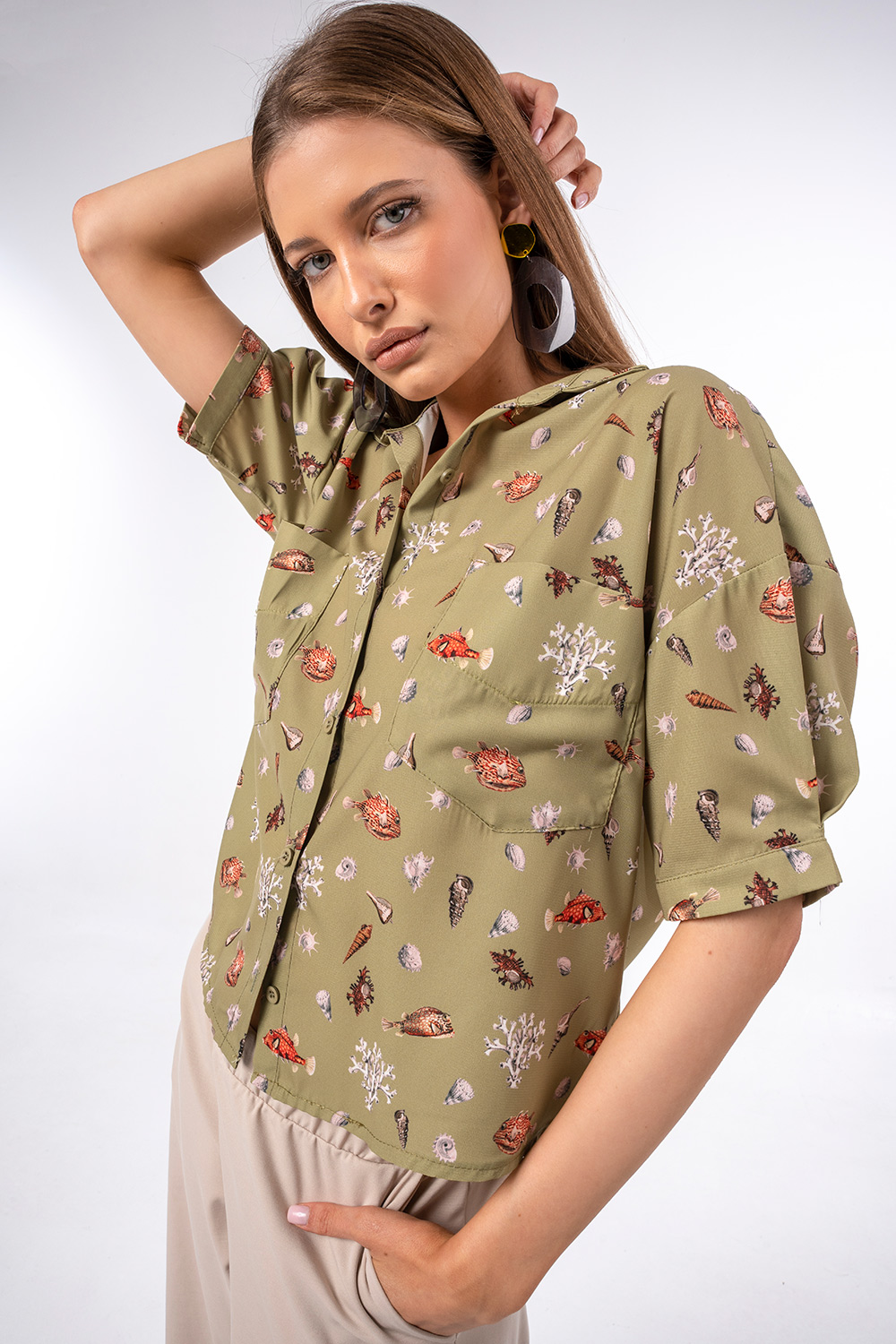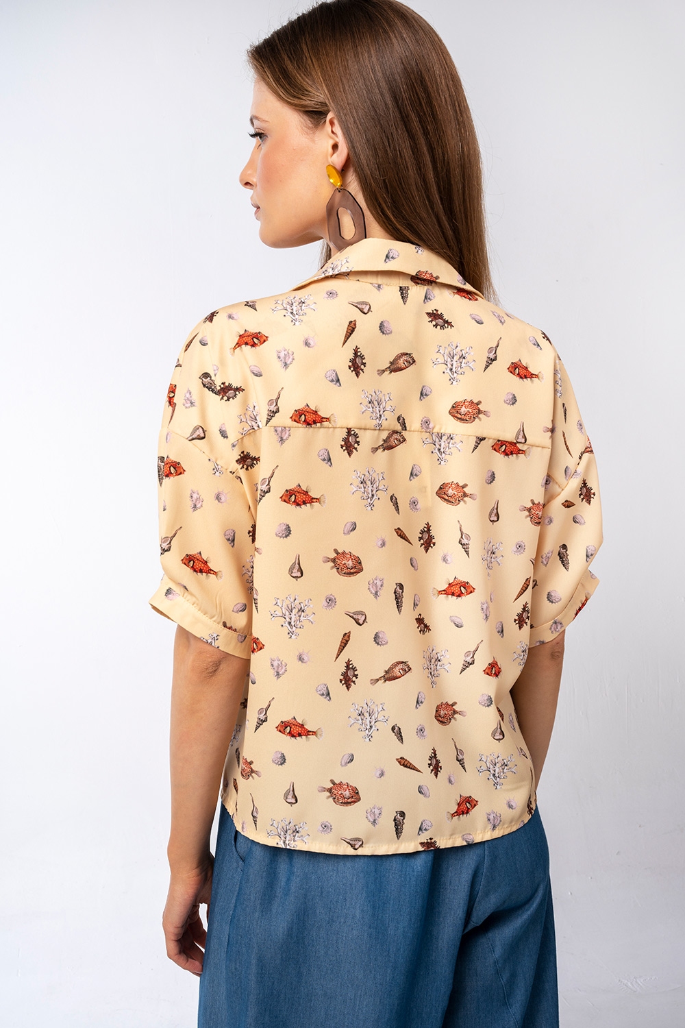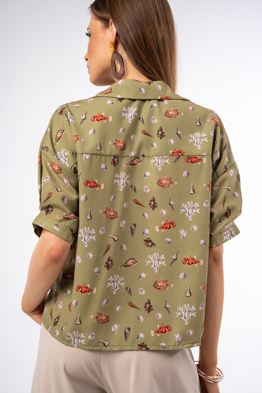 Τα μοτίβα με κοχύλια και θαλάσσια στοιχεία προσθέτουν χαρακτήρα και κάνουν το κομμάτι να ξεχωρίζει.Η χαλαρή του γραμμή και το ανάλαφρο ύφασμα προσφέρουν άνεση και δροσερή αίσθηση, ενώ τα κοντά μανίκια και το κλασικό γιακά με κουμπιά το καθιστούν ιδανικό για casual αλλά και πιο προσεγμένες εμφανίσεις. Διαθέτει πρακτικές μπροστινές τσέπες που ενισχύουν το σύγχρονο design.