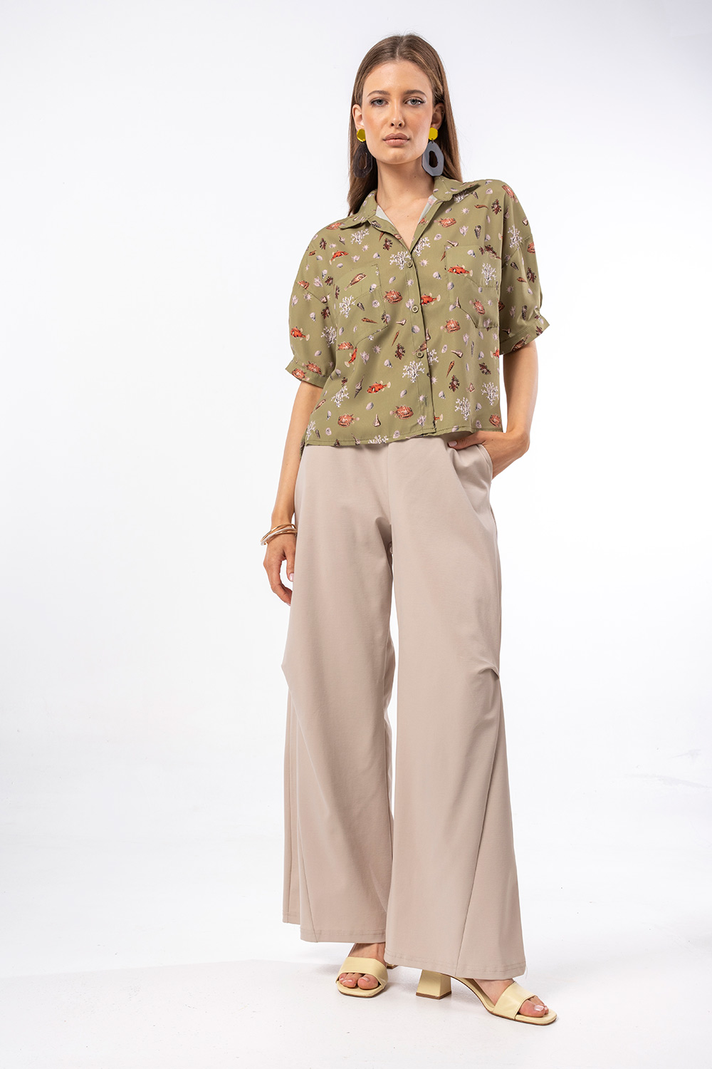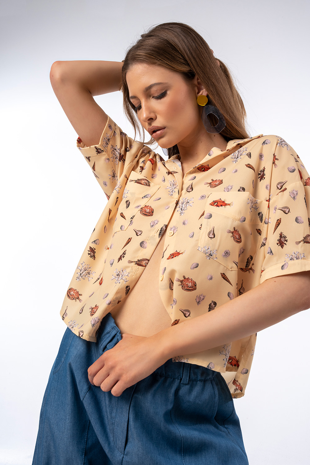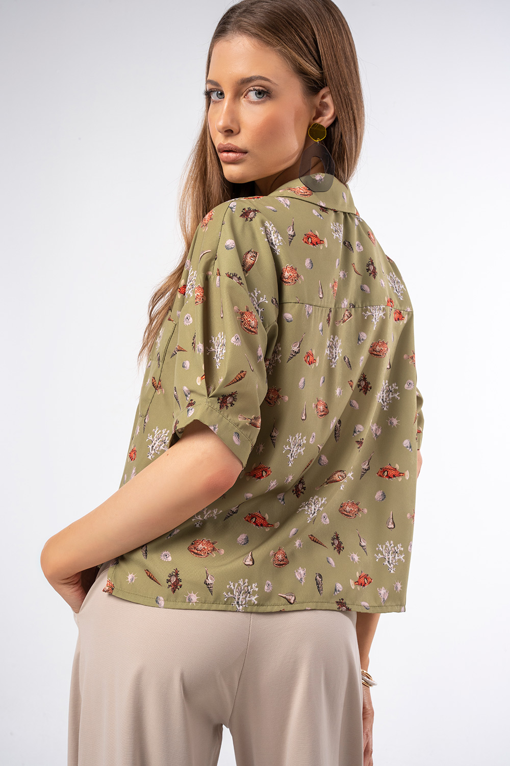 Τα μοτίβα με κοχύλια και θαλάσσια στοιχεία προσθέτουν χαρακτήρα και κάνουν το κομμάτι να ξεχωρίζει.Η χαλαρή του γραμμή και το ανάλαφρο ύφασμα προσφέρουν άνεση και δροσερή αίσθηση, ενώ τα κοντά μανίκια και το κλασικό γιακά με κουμπιά το καθιστούν ιδανικό για casual αλλά και πιο προσεγμένες εμφανίσεις. Διαθέτει πρακτικές μπροστινές τσέπες που ενισχύουν το σύγχρονο design.