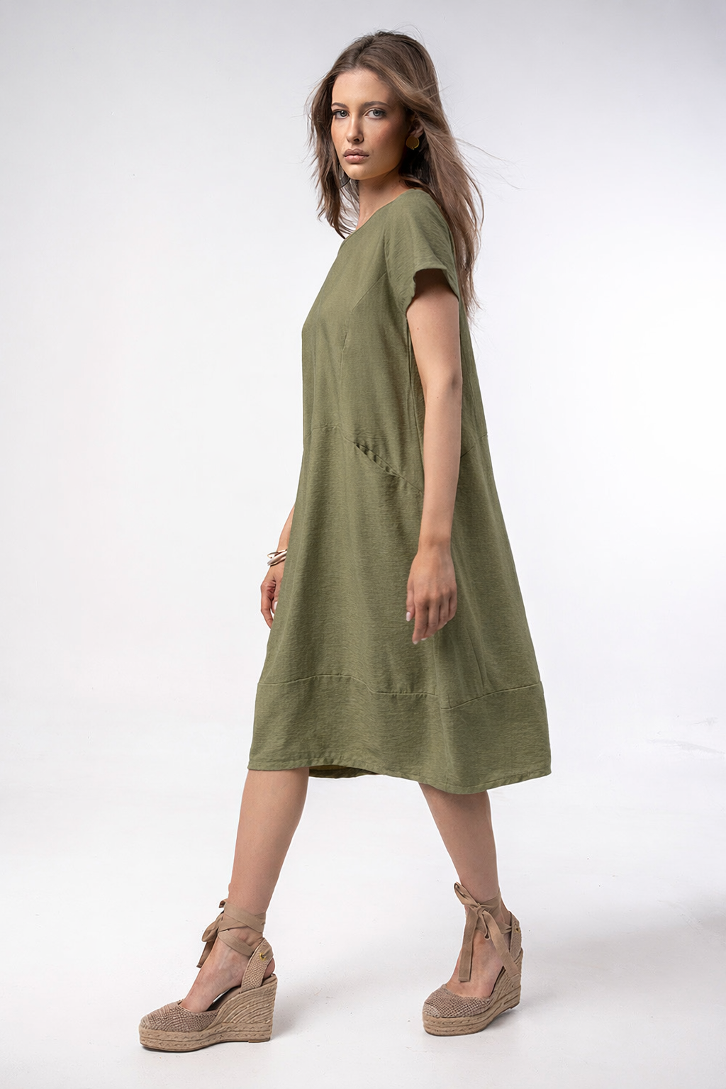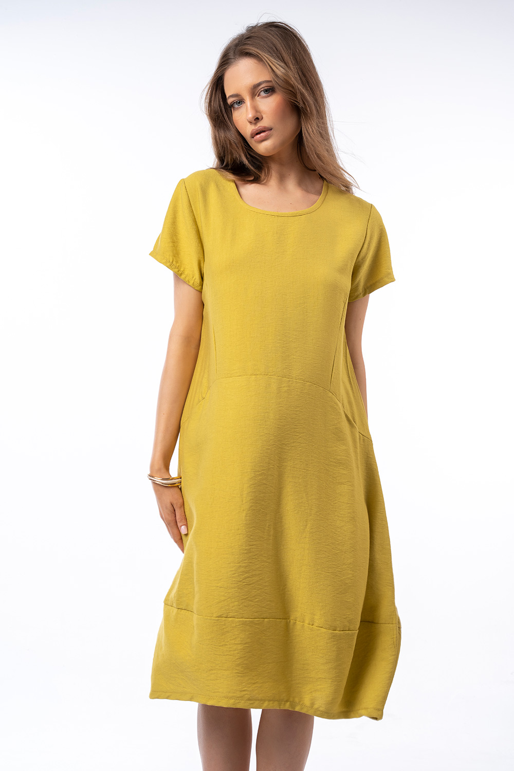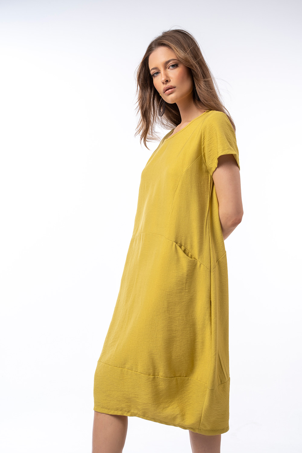 Αέρινο midi φόρεμα με κοντό μανίκι και διακριτικές πλαϊνές τσέπες για άνεση και πρακτικότητα. Η χαλαρή γραμμή του προσφέρει ευκολία στην κίνηση, ενώ ο minimal σχεδιασμός το καθιστά ιδανικό για καθημερινές, κομψές εμφανίσεις.