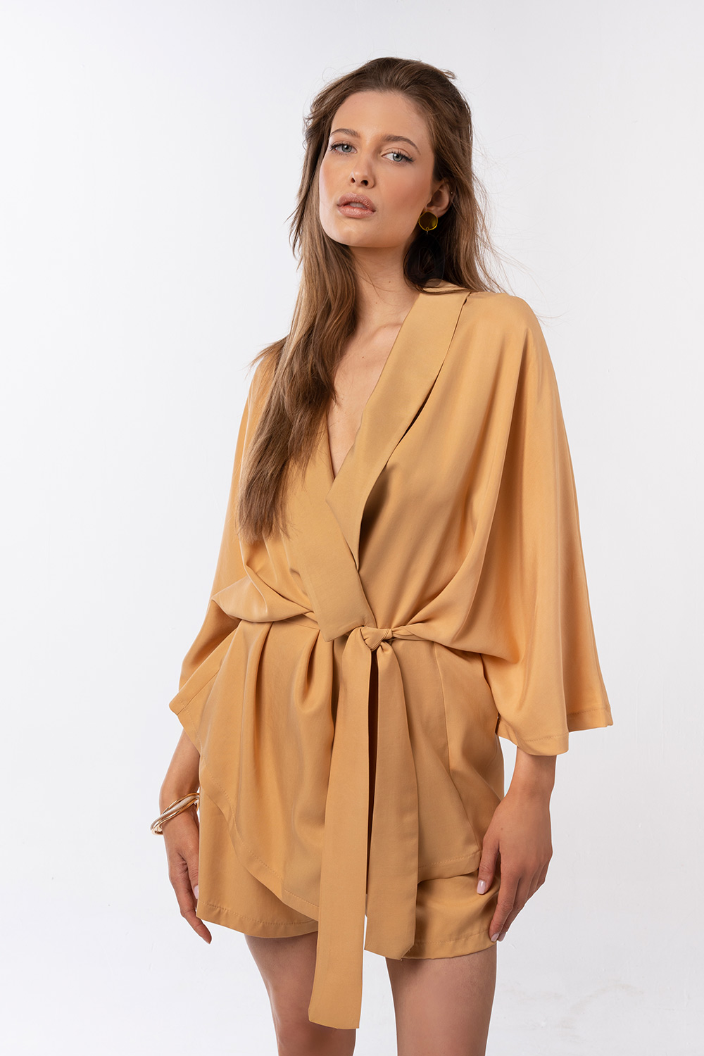 Κομψό κιμονό με ρευστή υφή και θηλυκή γραμμή που χαρίζει κίνηση και κομψότητα. Διαθέτει μακριά μανίκια σε χαλαρή γραμμή και ζώνη στη μέση για ρυθμιζόμενη εφαρμογή που αναδεικνύει τη σιλουέτα. Ιδανικό για elegant αλλά και σύγχρονες εμφανίσεις, φοριέται μόνο του ή ως σετ, από το πρωί έως το βράδυ.