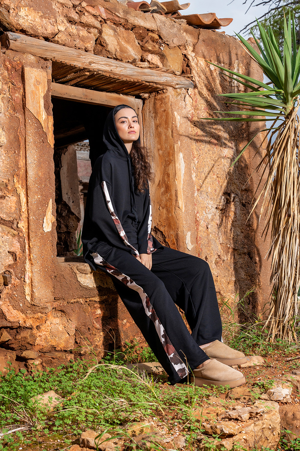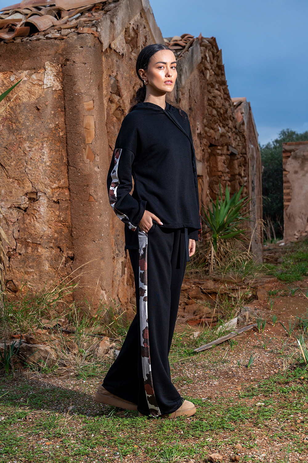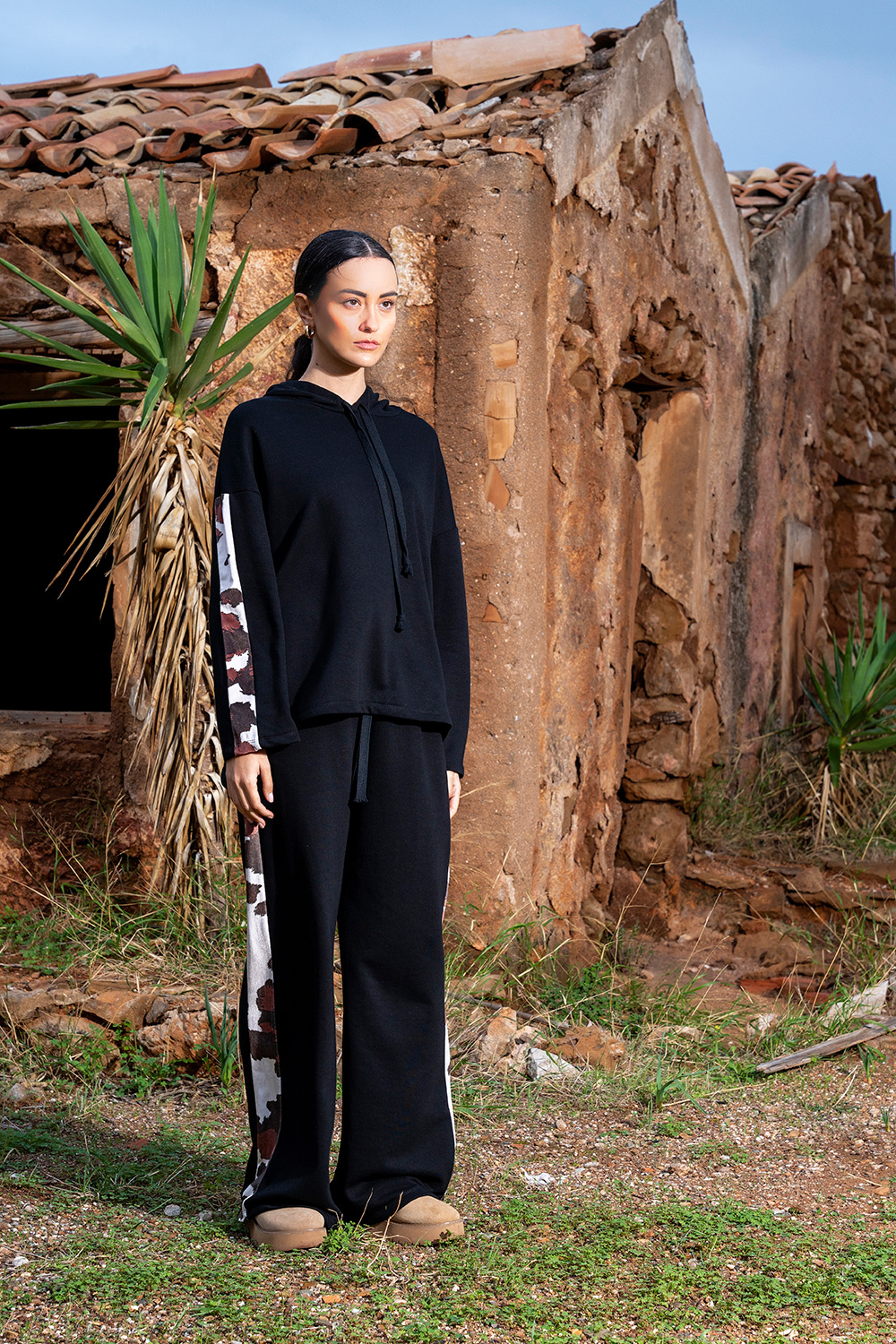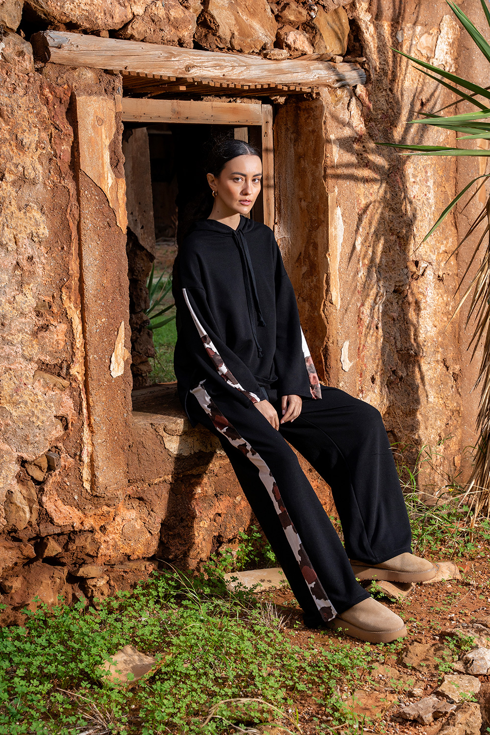 Άνετη oversized μπλούζα σε μαύρο χρώμα με εντυπωσιακές printed λεπτομέρειες στο μανίκι. Απαλό ύφασμα, χαλαρή εφαρμογή και ιδανική για καθημερινά looks. Συνδύασε τη με το αντίστοιχο παντελόνι για ολοκληρωμένο outfit.