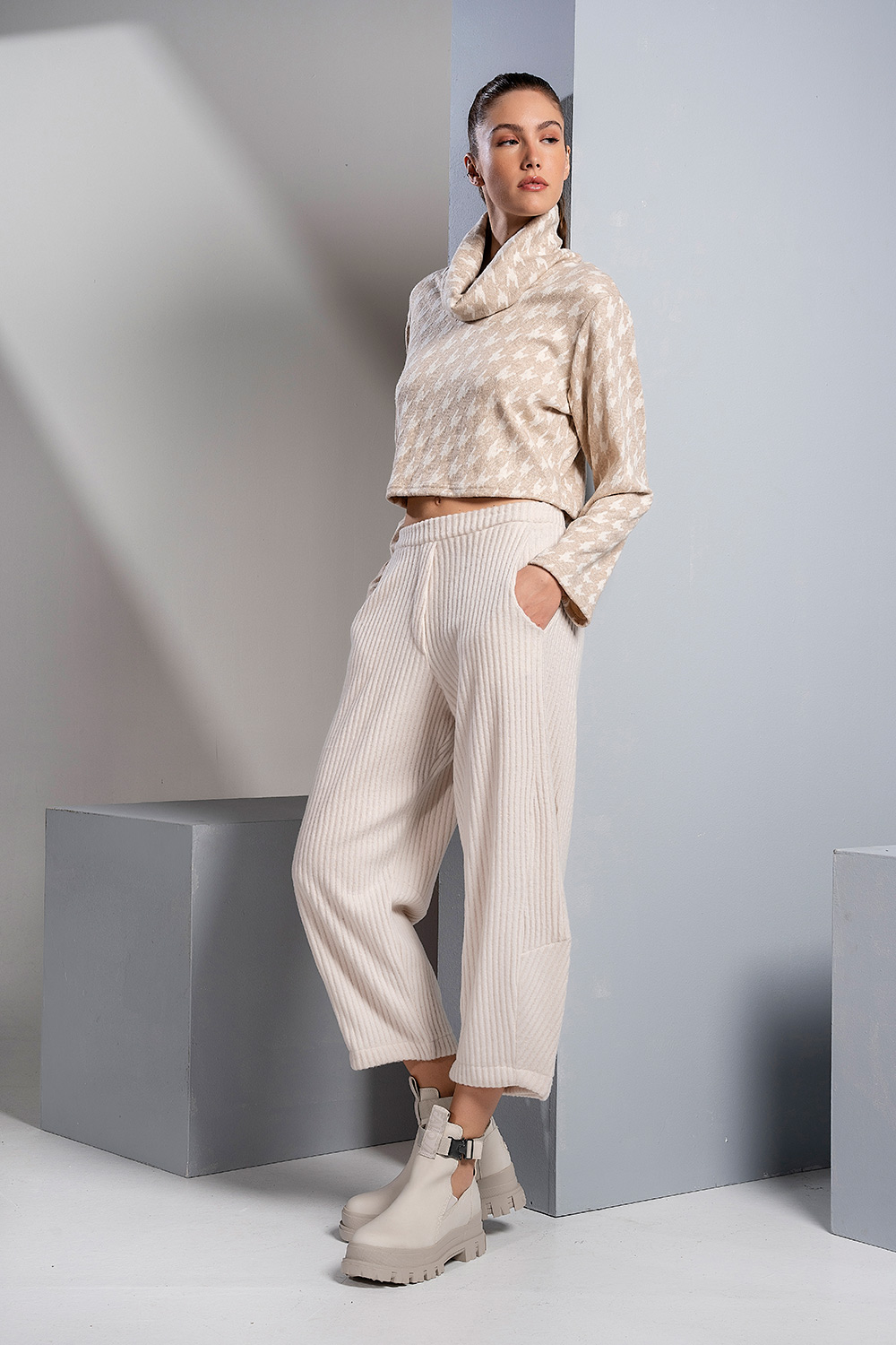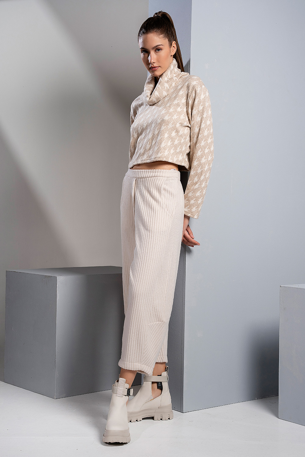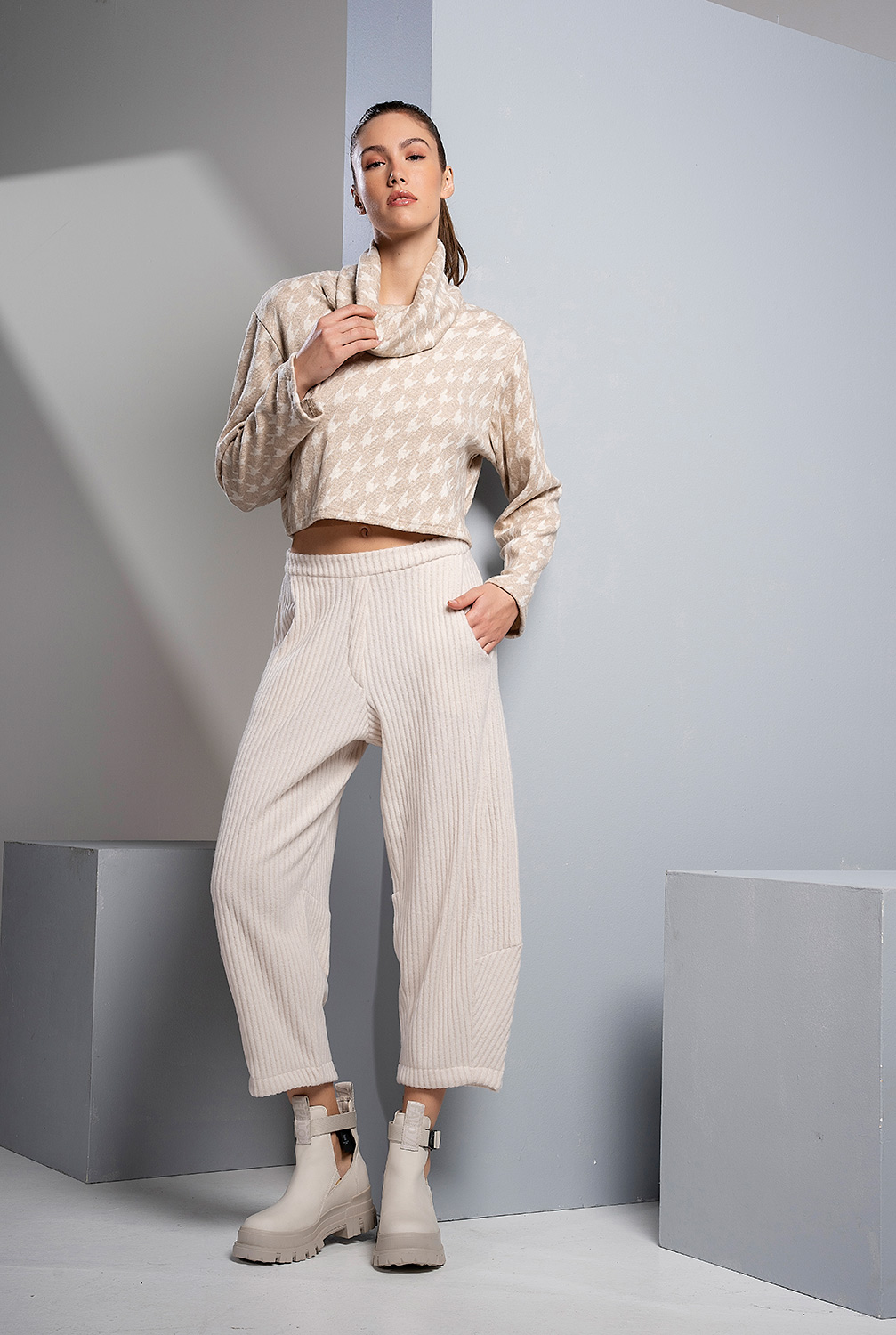 Αυτή η μοντέρνα κροπ μπλούζα διαθέτει μεγάλο, χαλαρό ζιβάγκο (cowl neck) και μακριά μανίκια, προσφέροντας ζεστασιά και στυλ. Το ύφασμα έχει ένα διακριτικό μοτίβο τύπου pied de poule, που την καθιστά ένα chic και casual κομμάτι, ιδανικό για day-to-night εμφανίσεις.