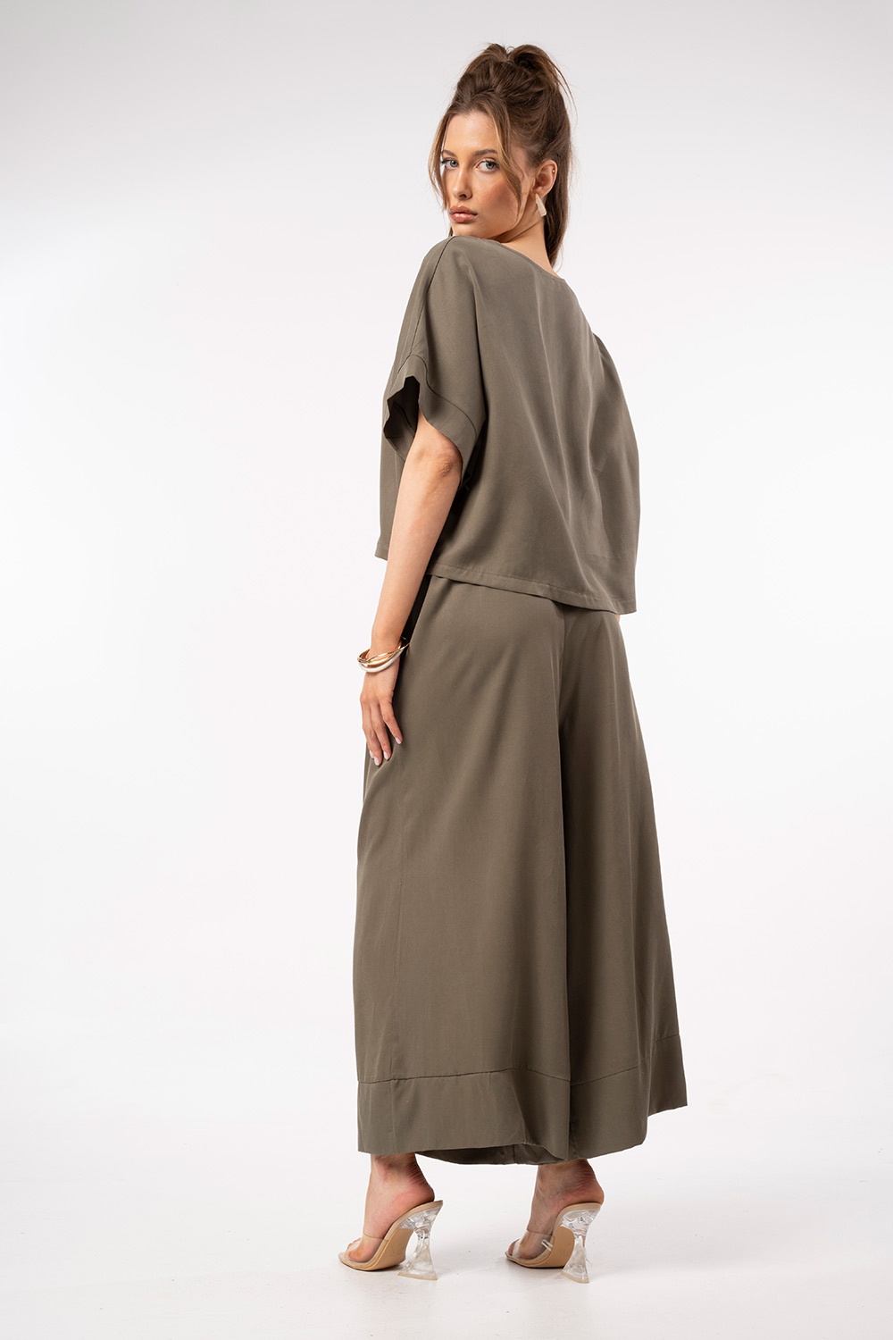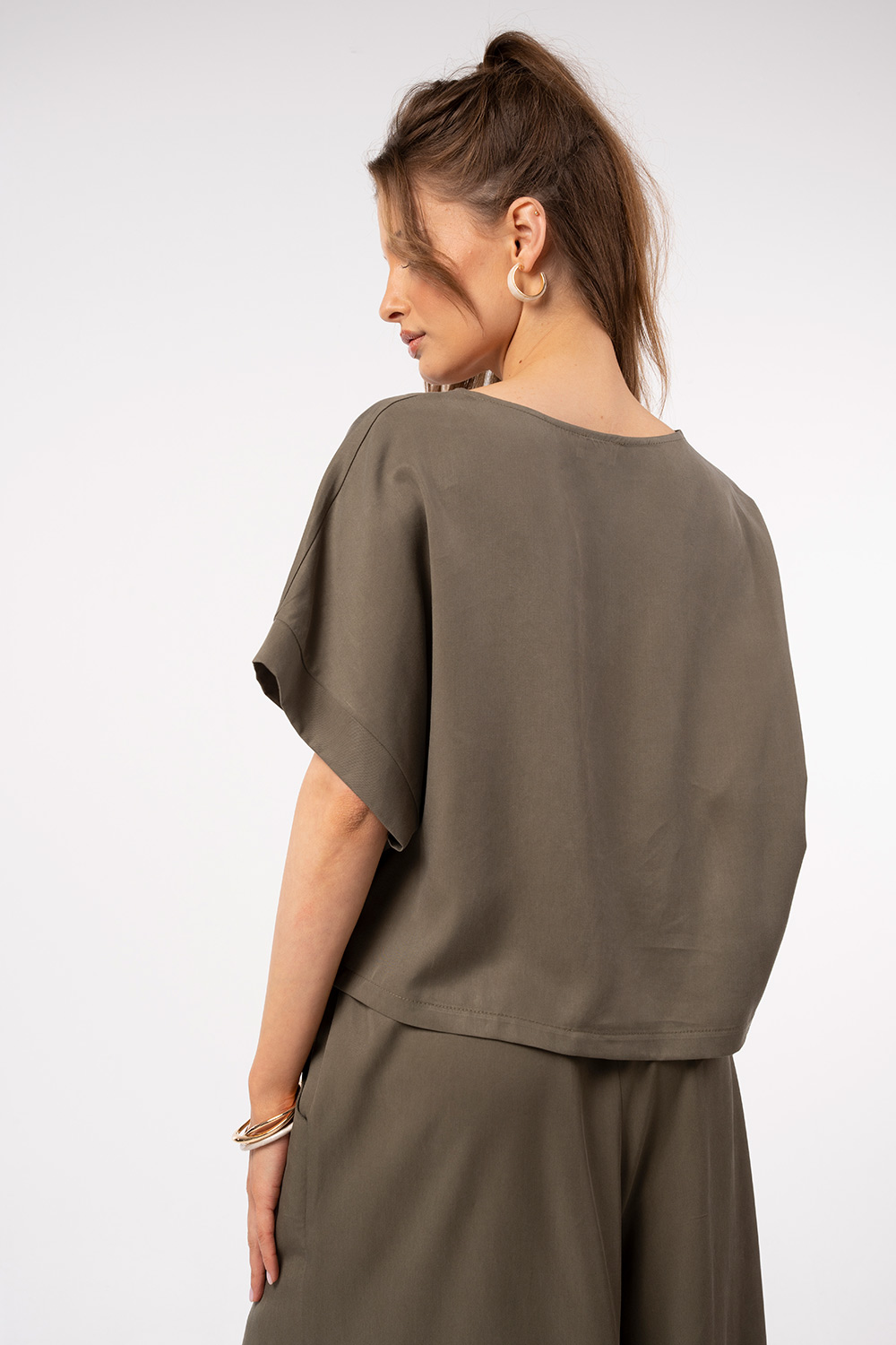 Minimal μπλούζα σε χαλαρή γραμμή με κοντό μανίκι και καθαρές γραμμές. Το ελαφρύ ύφασμα και η άνετη εφαρμογή την καθιστούν ιδανική για καθημερινές, σύγχρονες εμφανίσεις, φοριέται εύκολα μόνη της ή ως μέρος σετ.