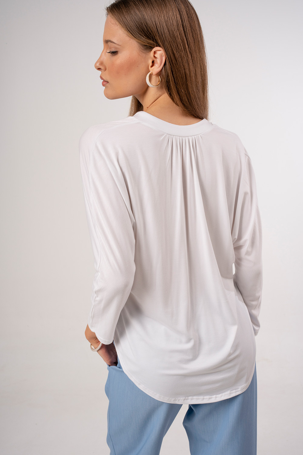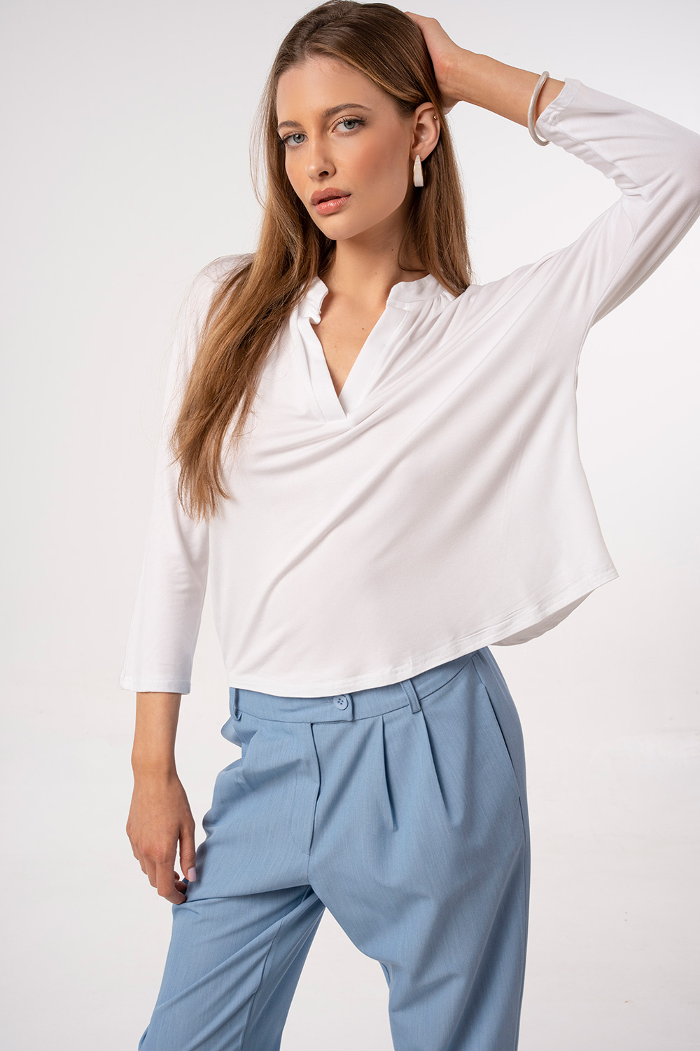 Κομψή μπλούζα με διακριτική V λαιμόκοψη και χαλαρή εφαρμογή που προσφέρει άνεση και θηλυκή αισθητική. Ο καθαρός σχεδιασμός της την καθιστά ιδανική επιλογή για καθημερινές αλλά και πιο προσεγμένες εμφανίσεις, ενώ το απαλό ύφασμα εξασφαλίζει ευχάριστη αίσθηση όλη μέρα. Συνδυάζεται εύκολα με παντελόνια, φούστες ή σακάκια, αποτελώντας βασικό κομμάτι κάθε γκαρνταρόμπας.