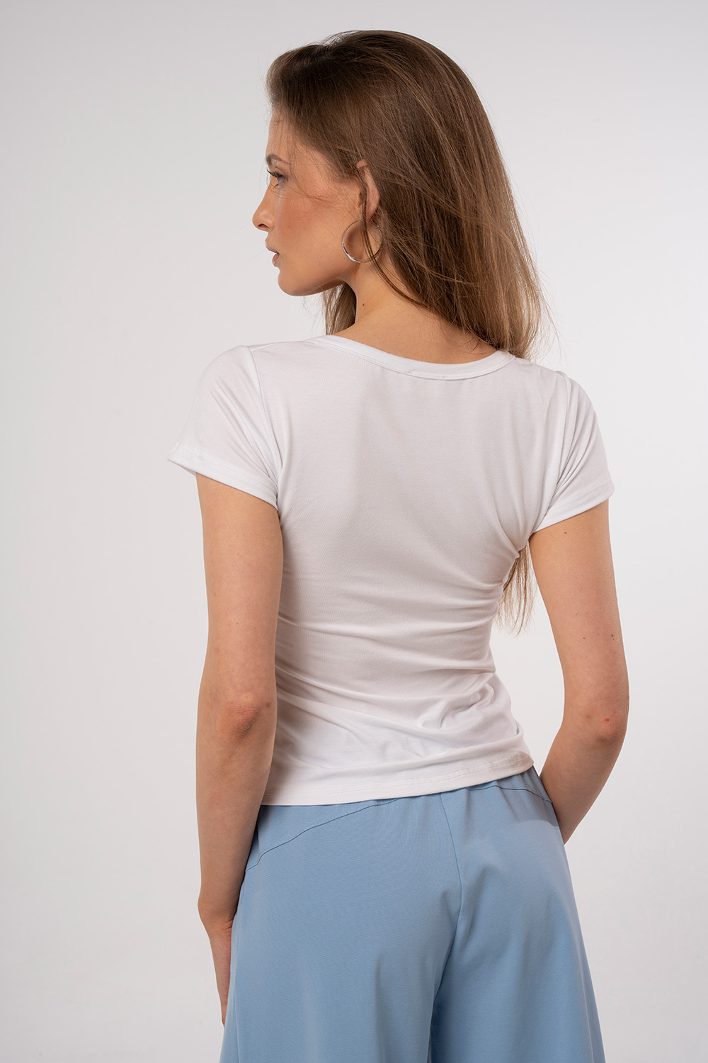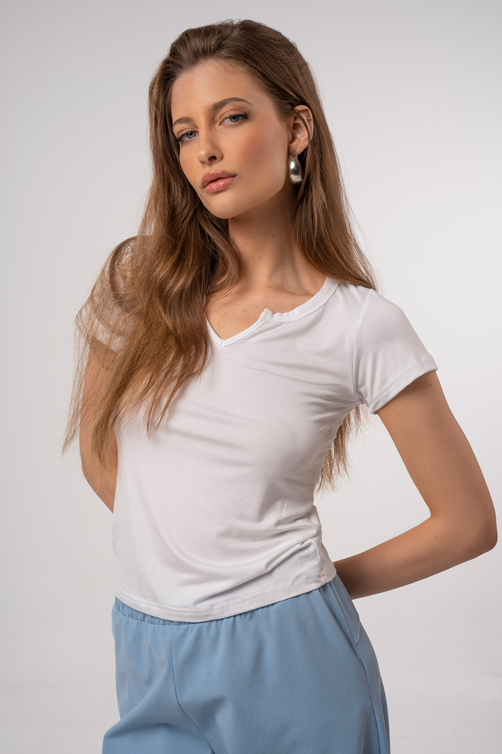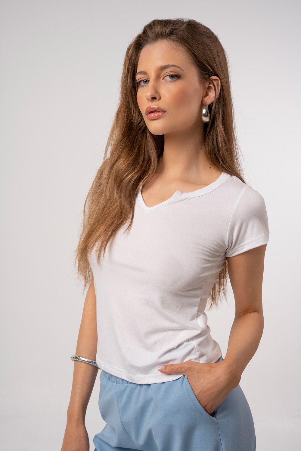 Γυναικεία μπλούζα με V λαιμόκοψη. Το ελαφρύ ύφασμα αγκαλιάζει απαλά το σώμα, ενώ το διακριτικό κόψιμο την καθιστά ιδανική για καθημερινές αλλά και πιο προσεγμένες εμφανίσεις. Συνδυάζεται εύκολα με παντελόνια ή φούστες για all-day looks.