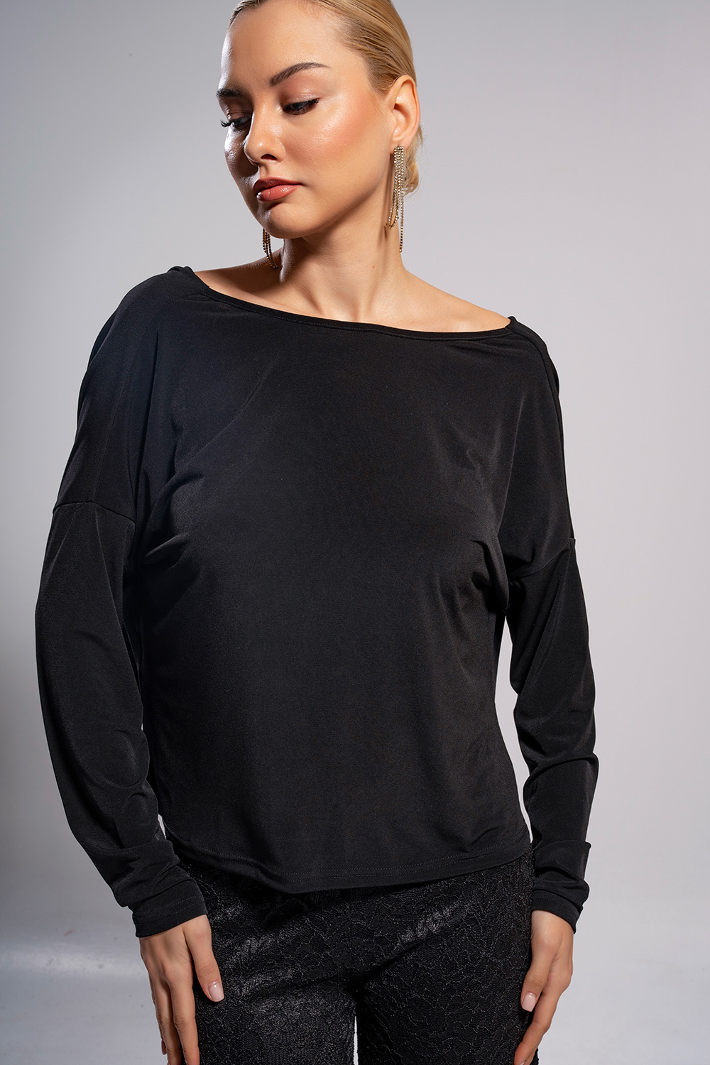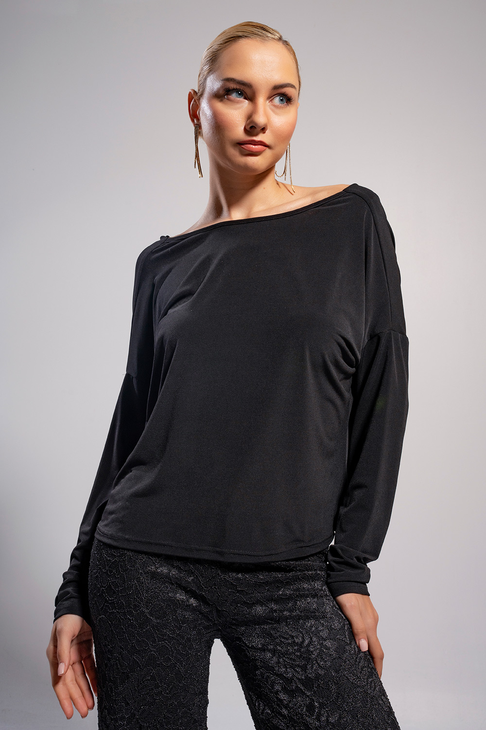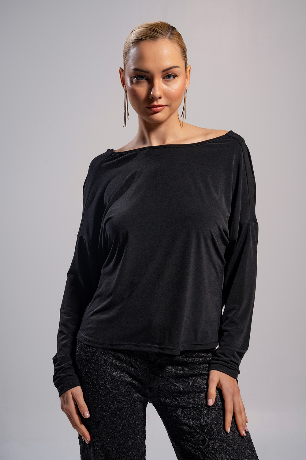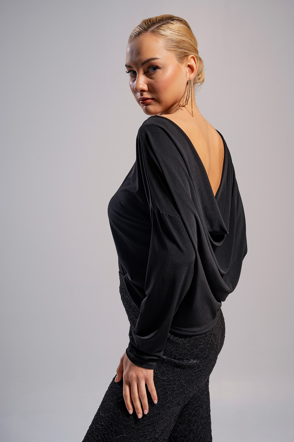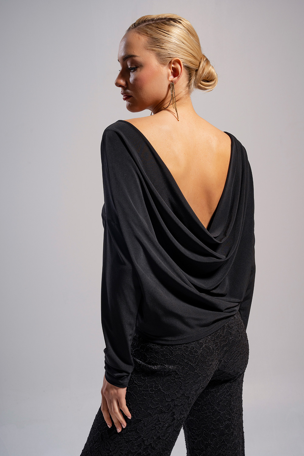 Κομψή μπλούζα με ανοιχτή πλάτη που αποπνέει διακριτική θηλυκότητα και σύγχρονη κομψότητα. Η χαλαρή γραμμή της προσφέρει άνετη εφαρμογή, ενώ το εντυπωσιακό ντραπέ άνοιγμα στο πίσω μέρος δημιουργεί ένα elegant και ιδιαίτερο στοιχείο. Ιδανική επιλογή για βραδινές εμφανίσεις αλλά και chic σύνολα, συνδυάζεται εύκολα με παντελόνια ή φούστες για ένα ισορροπημένο και stylish αποτέλεσμα.