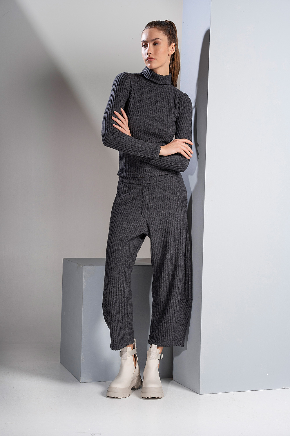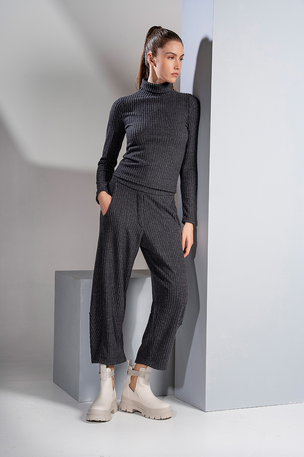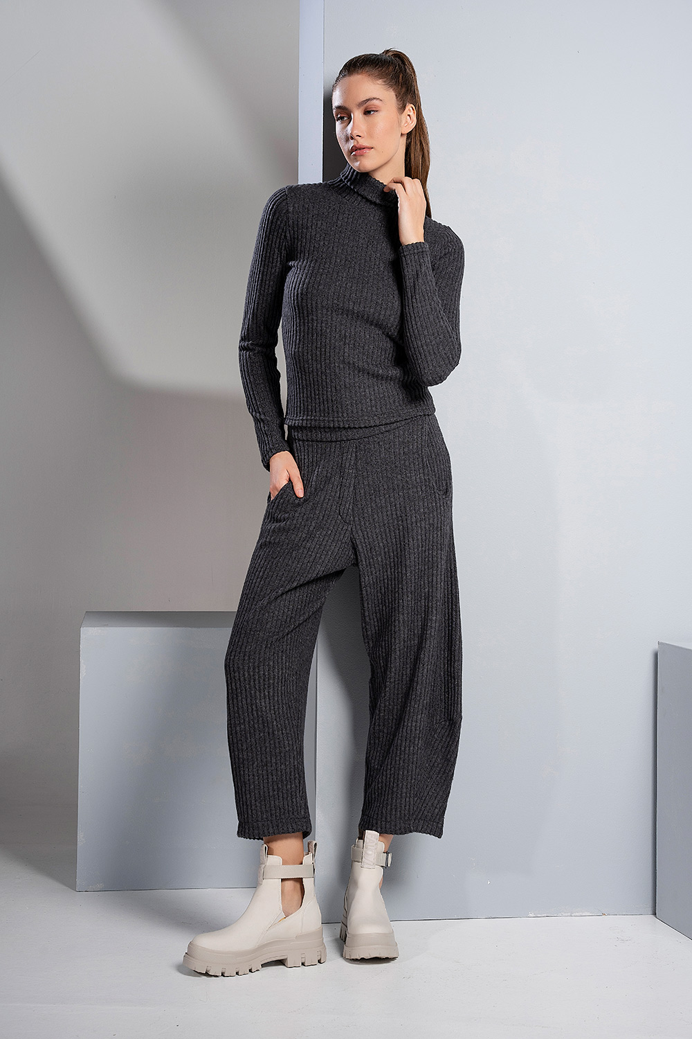 Αυτή η μπλούζα από ζεστή ριμπ πλέξη διαθέτει ψηλό ζιβάγκο και μακριά μανίκια, προσφέροντας μια εφαρμοστή και κομψή γραμμή. Το ελαστικό και πλεκτό ύφασμα εξασφαλίζει άνεση και στυλ, καθιστώντας τη ένα βασικό κομμάτι για layering και casual chic εμφανίσεις.