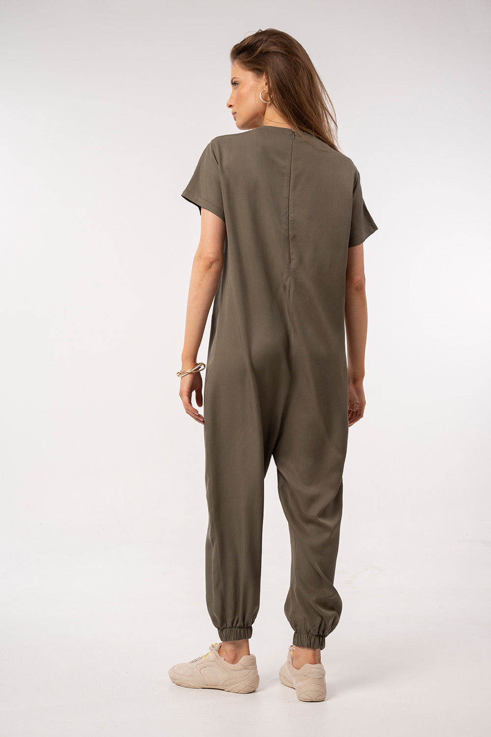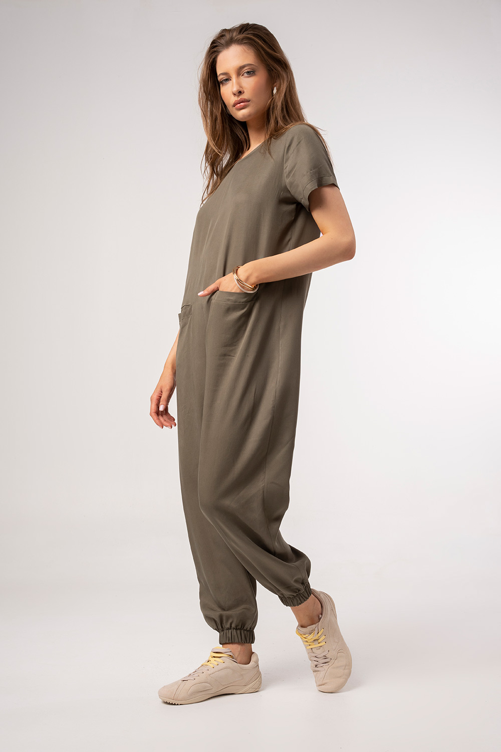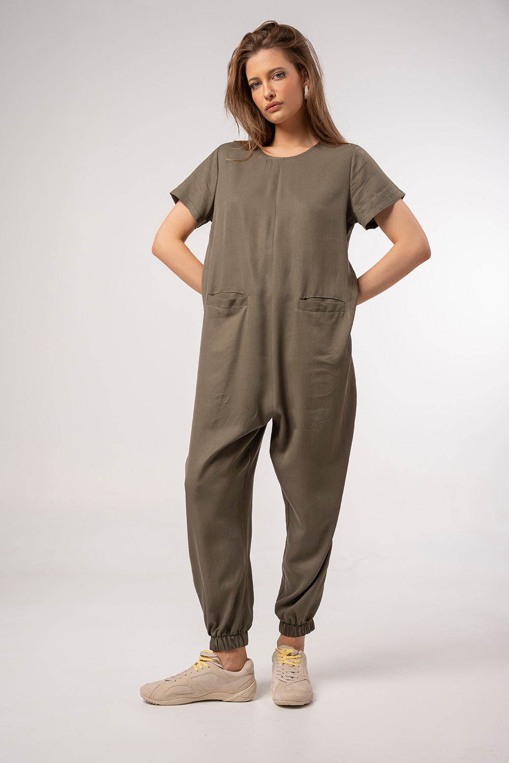 Σύγχρονη ολόσωμη φόρμα με minimal σχεδιασμό και άνετη γραμμή που προσφέρει απόλυτη ελευθερία κινήσεων. Διαθέτει κοντό μανίκι, στρογγυλή λαιμόκοψη και πρακτικές πλαϊνές τσέπες, ενώ το τελείωμα με λάστιχο στους αστραγάλους χαρίζει χαλαρό αλλά προσεγμένο look. Ιδανική επιλογή για καθημερινές εμφανίσεις, ταξίδια ή casual city looks, φοριέται εύκολα με sneakers ή σανδάλια.