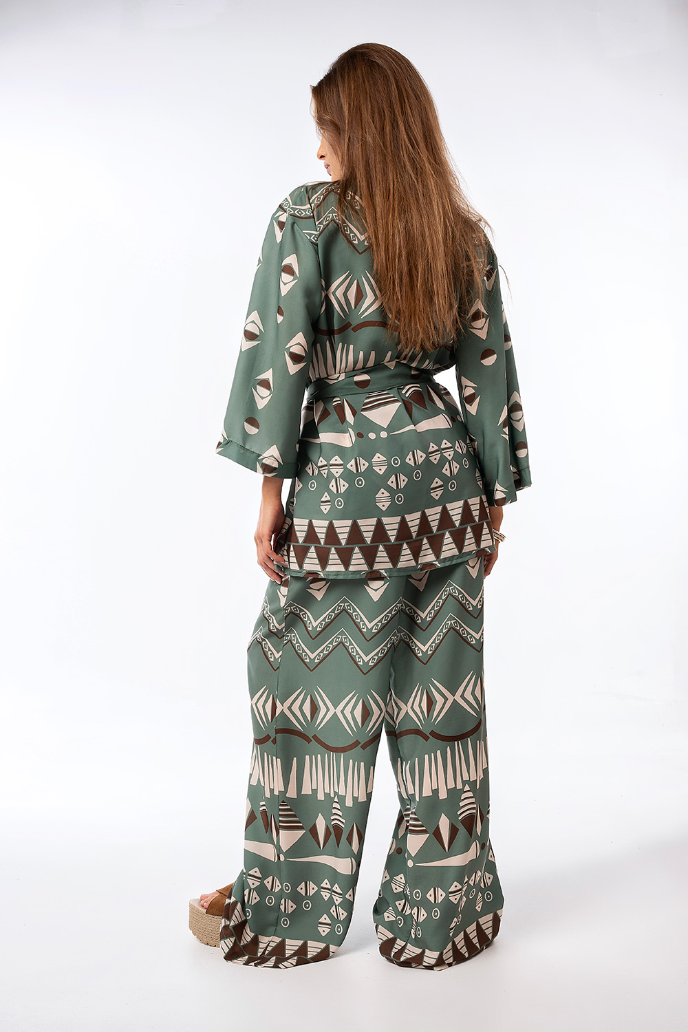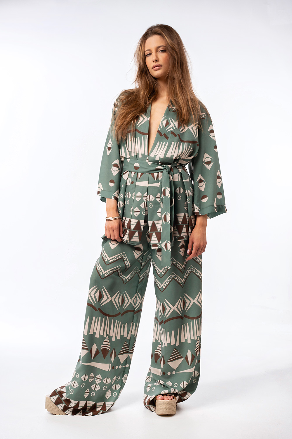 Κομψή παντελόνα με φαρδιά γραμμή που χαρίζει άνεση και κίνηση. Το εντυπωσιακό μοτίβο προσθέτει χαρακτήρα, ενώ η άνετη εφαρμογή την καθιστά ιδανική για καθημερινές αλλά και πιο προσεγμένες εμφανίσεις. Συνδυάζεται τέλεια με το αντίστοιχο κιμονό για ολοκληρωμένο σύνολο ή με basic tops για ισορροπημένο styling.