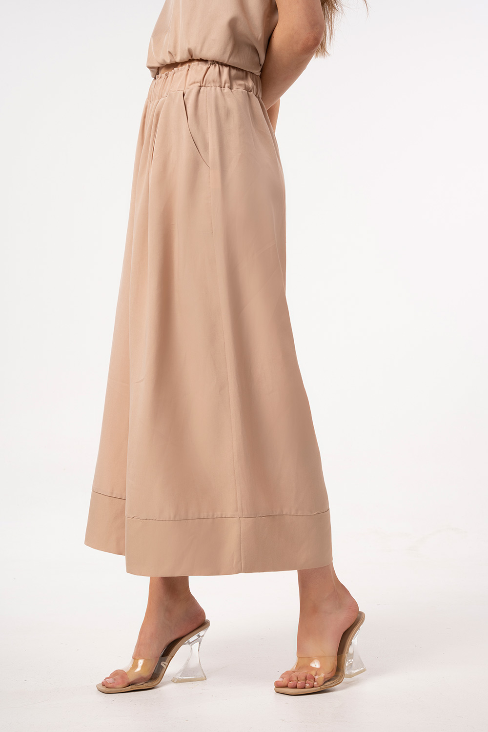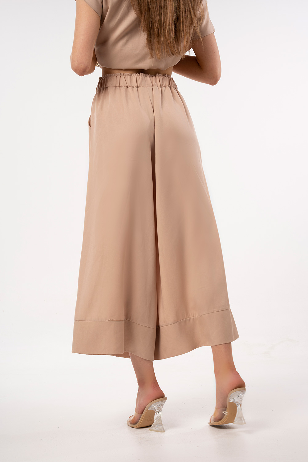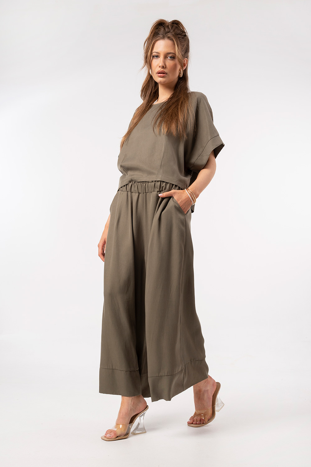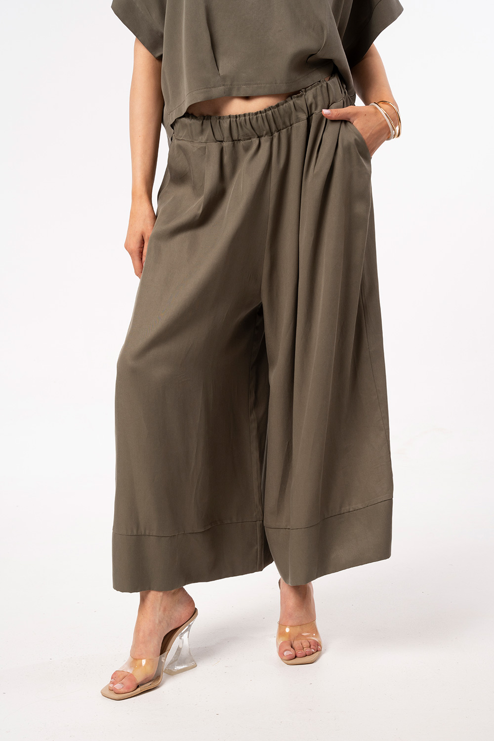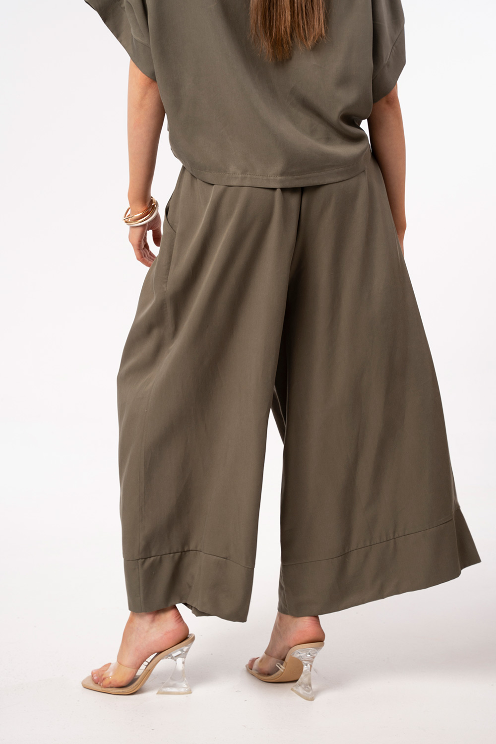 Αέρινη παντελόνα με φαρδιά γραμμή που προσφέρει άνεση και κομψή κίνηση σε κάθε βήμα. Ο minimal σχεδιασμός της την καθιστά ευέλικτη για καθημερινές αλλά και πιο προσεγμένες εμφανίσεις. Συνδυάζεται ιδανικά με το αντίστοιχο κιμονό για ολοκληρωμένο look ή με basic tops για διαχρονικό στυλ.