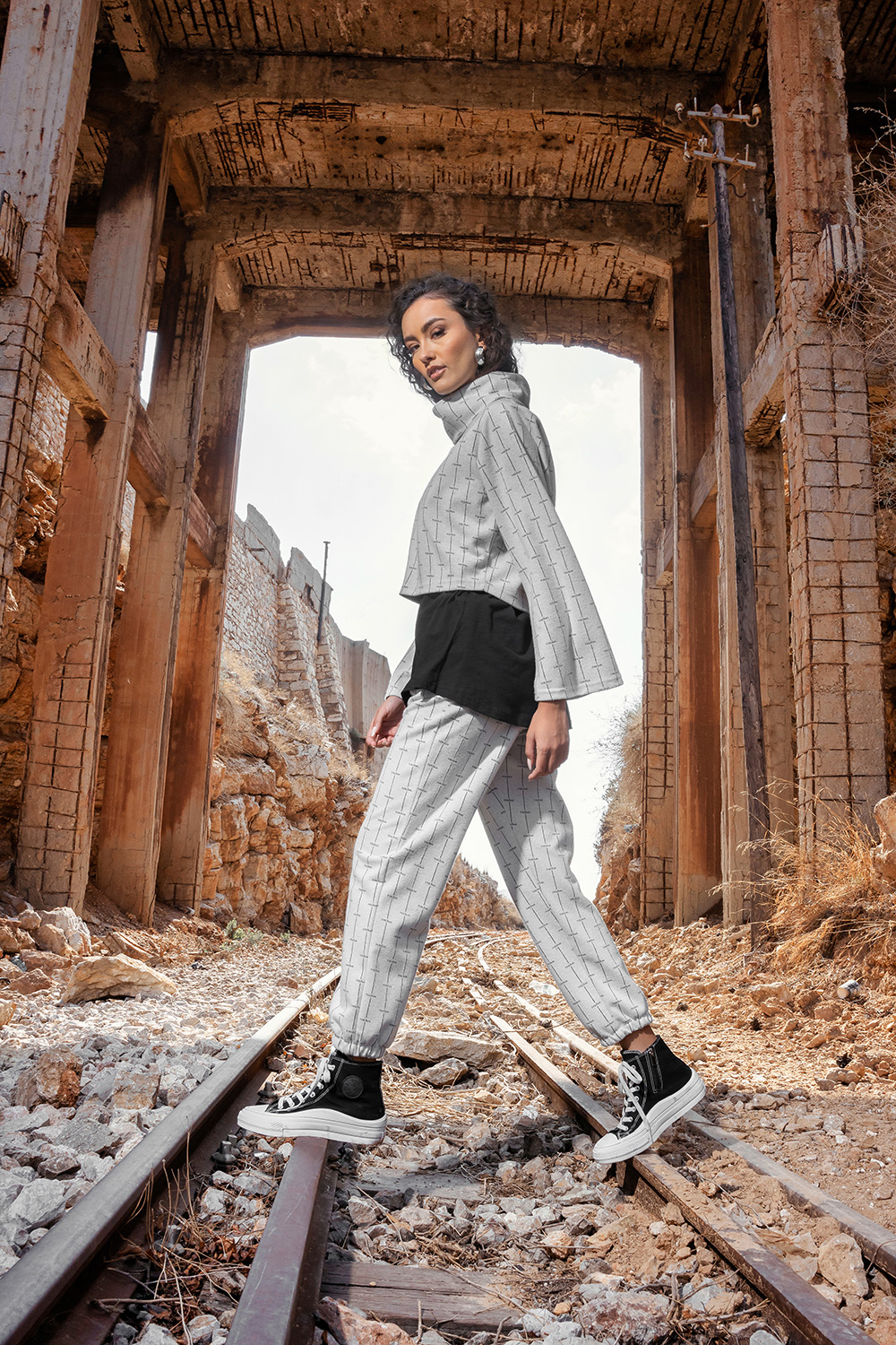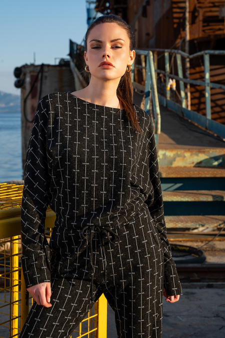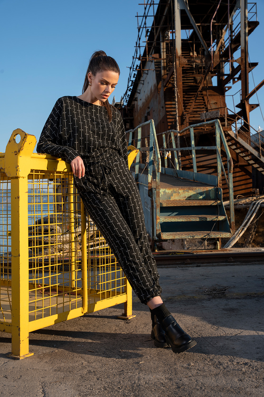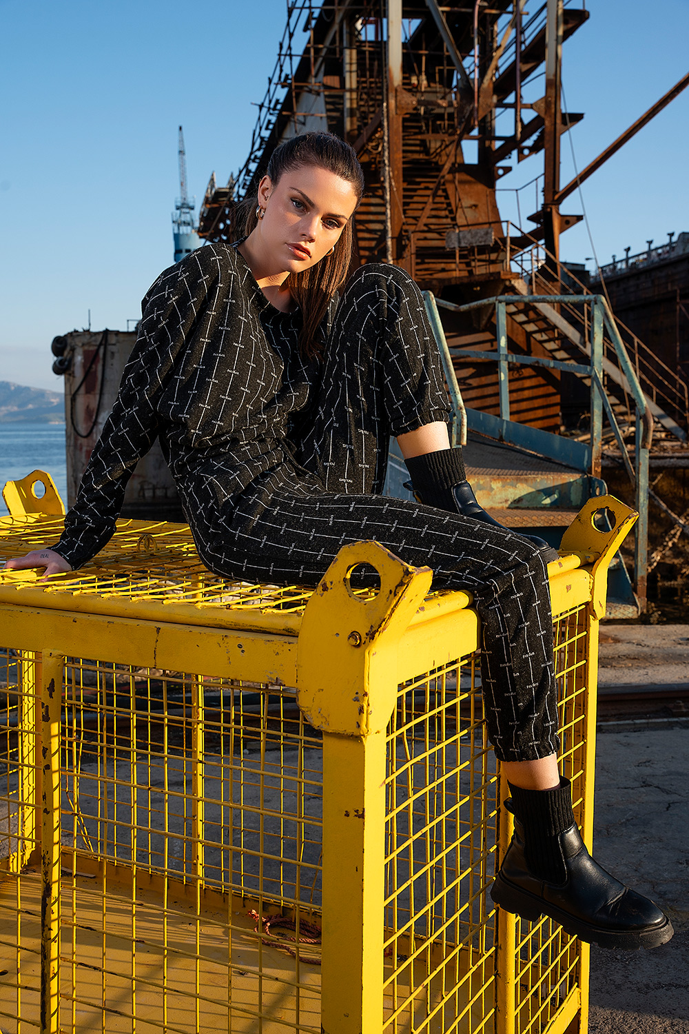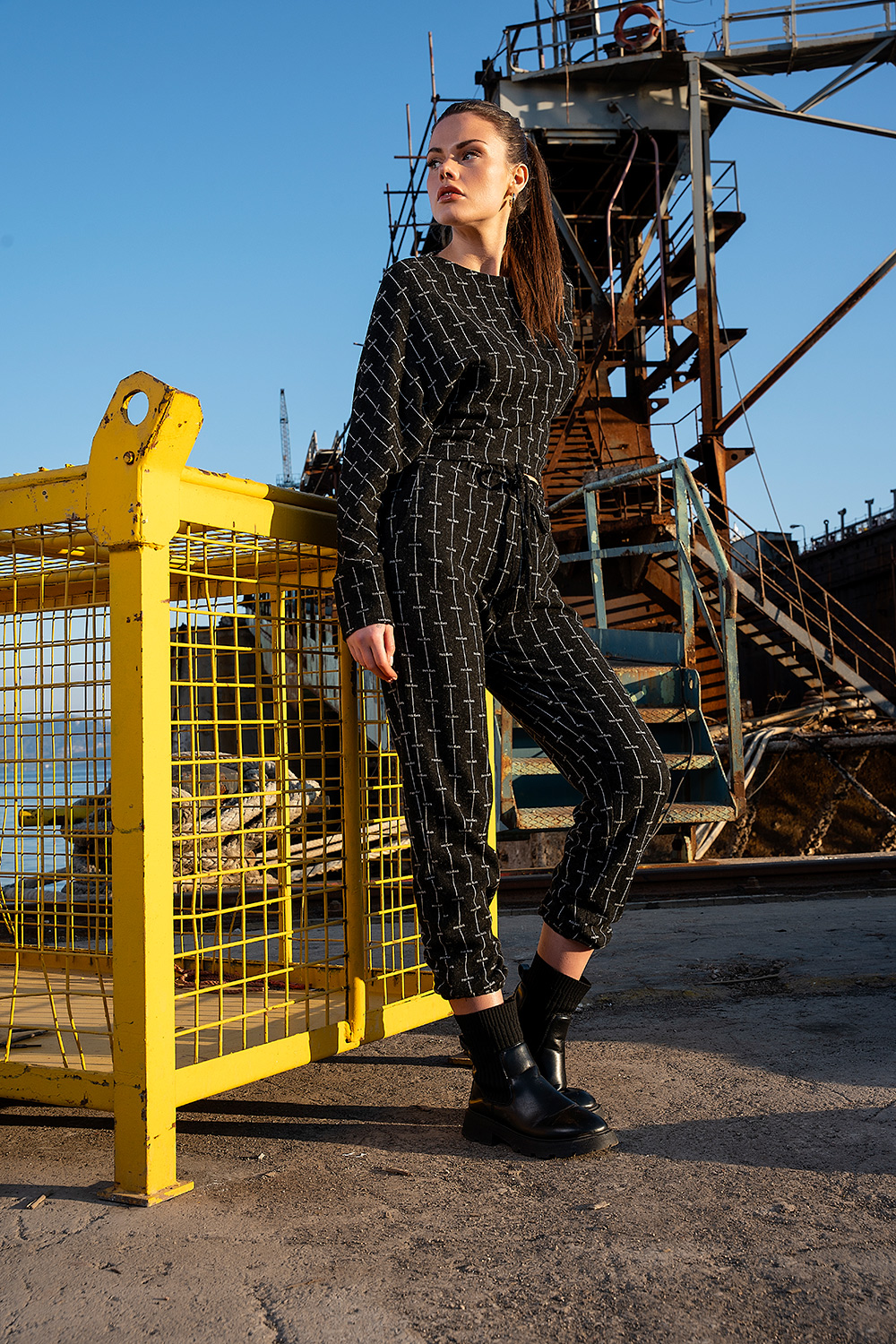Μοντέρνο jumpsuit με διακριτικό γεωμετρικό μοτίβο και ζώνη στη μέση για άψογη εφαρμογή. Η άνετη γραμμή και τα λάστιχα στους αστραγάλους προσφέρουν στιλ και ευκολία στην καθημερινή κίνηση. Ιδανική επιλογή για urban εμφανίσεις με δυναμικό χαρακτήρα, από το πρωί έως το βράδυ.