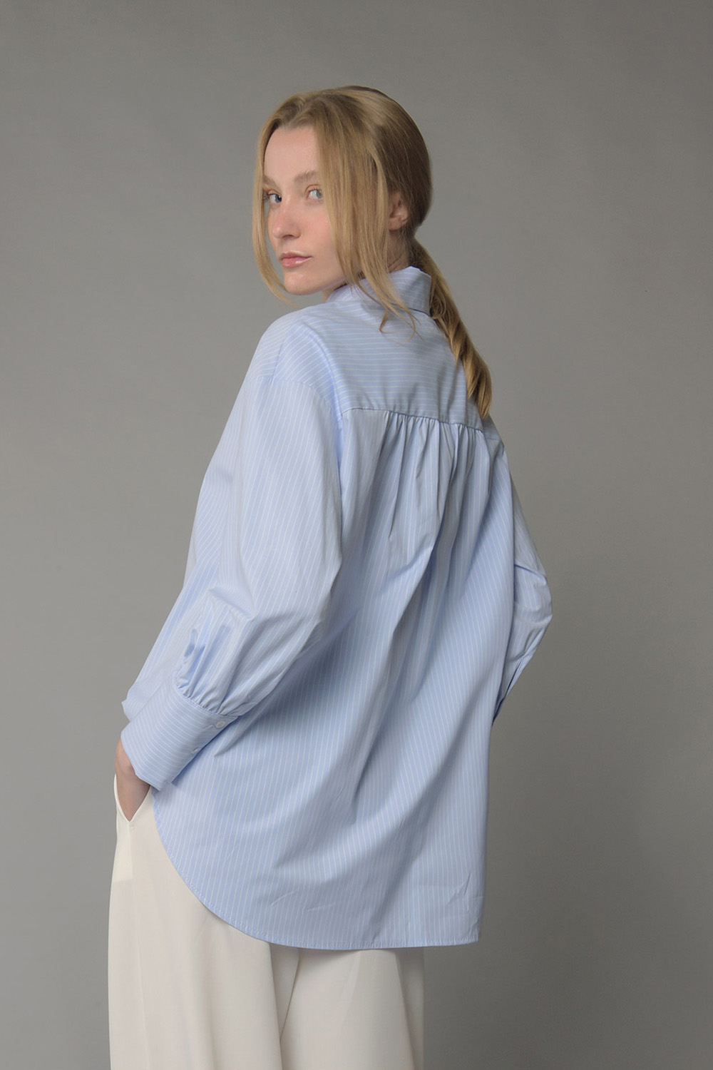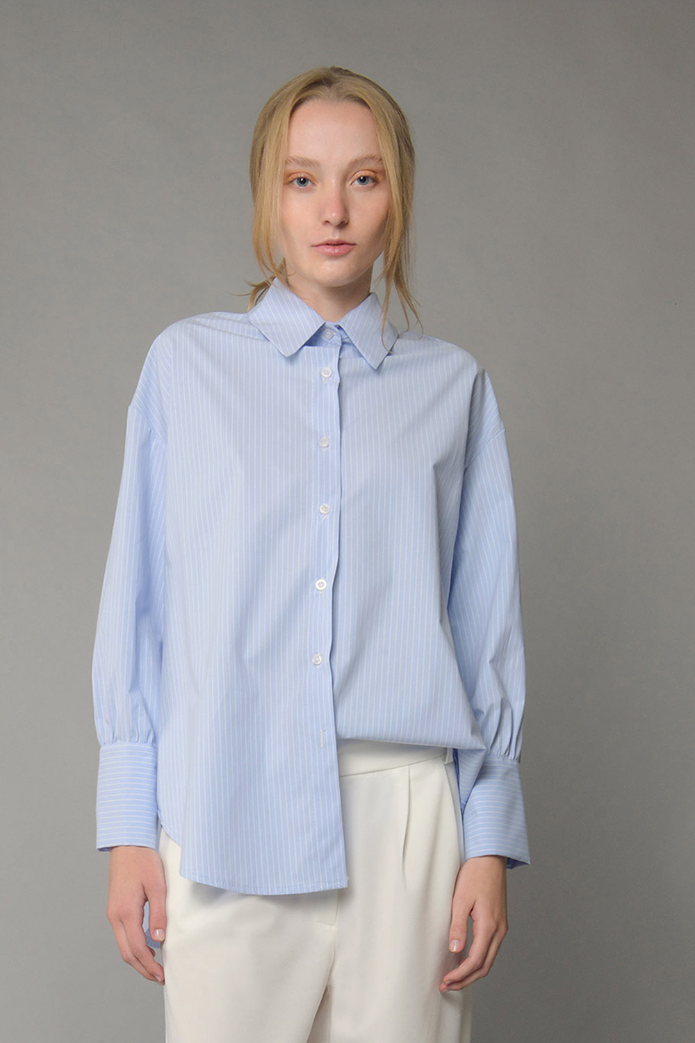Γυναικείο πουκάμισο με διακριτικό ριγέ μοτίβο και χαλαρή γραμμή που προσφέρει άνεση και διαχρονική κομψότητα. Διαθέτει κλασικό γιακά, κουμπιά στο μπροστινό μέρος και μακριά μανίκια με μανσέτα για προσεγμένο τελείωμα. Ιδανικό για office αλλά και smart casual εμφανίσεις, φοριέται άψογα με παντελόνια, jeans ή σε layering looks.