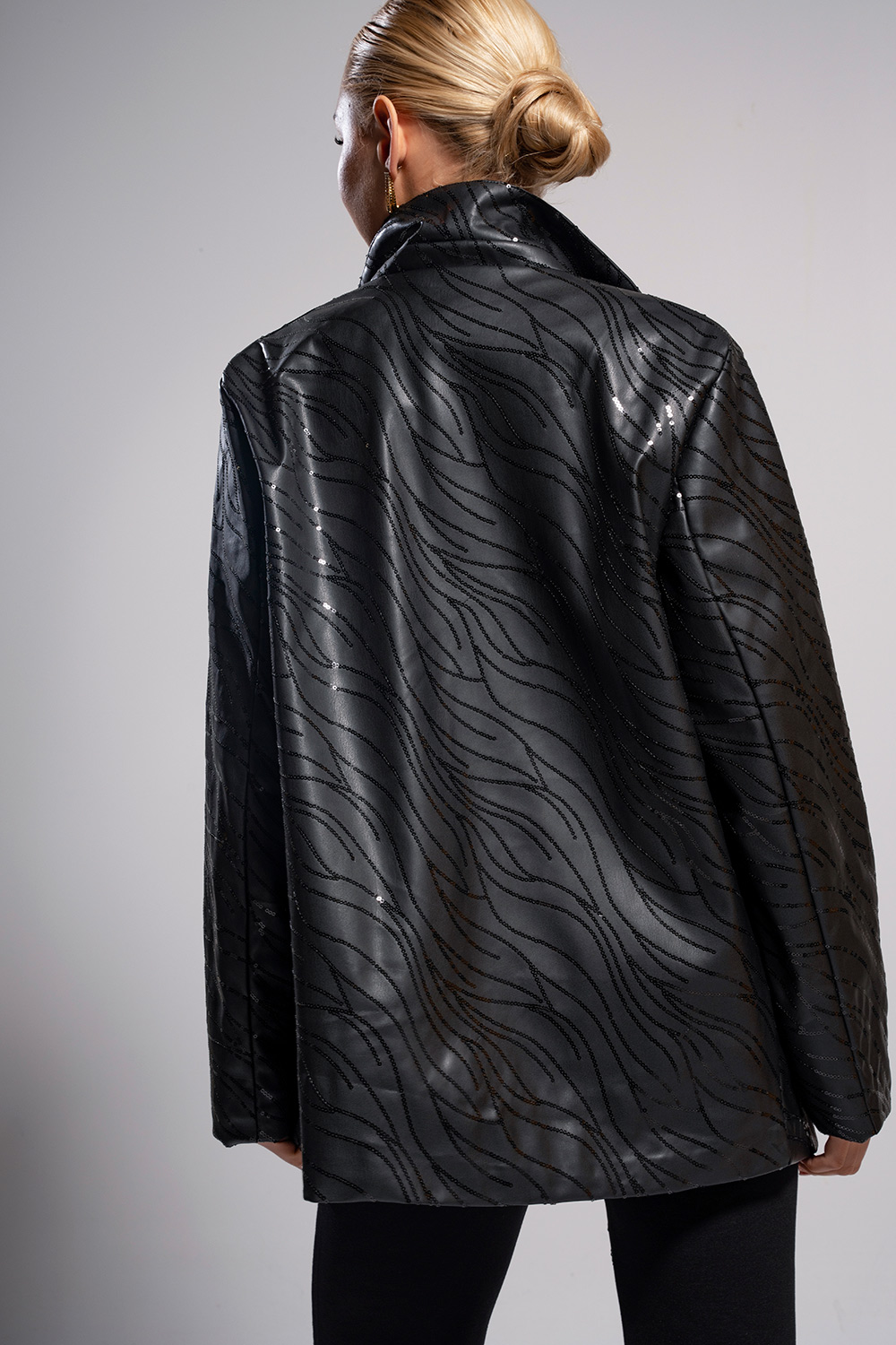 Εντυπωσιακό σακάκι δερματίνη με παγιέτες που συνδυάζει δυναμικό χαρακτήρα και διαχρονική κομψότητα. Η minimal γραμμή του αναδεικνύεται μέσα από τις λαμπερές λεπτομέρειες, δημιουργώντας ένα statement κομμάτι για βραδινές εμφανίσεις. Φοριέται ανοιχτό και ολοκληρώνει ιδανικά σύνολα με παντελόνια ή φούστες, προσφέροντας στυλ και αυτοπεποίθηση. Ιδανικό για party looks και εμφανίσεις που ξεχωρίζουν.